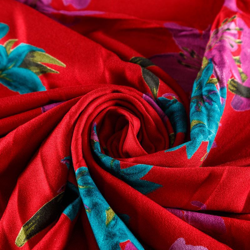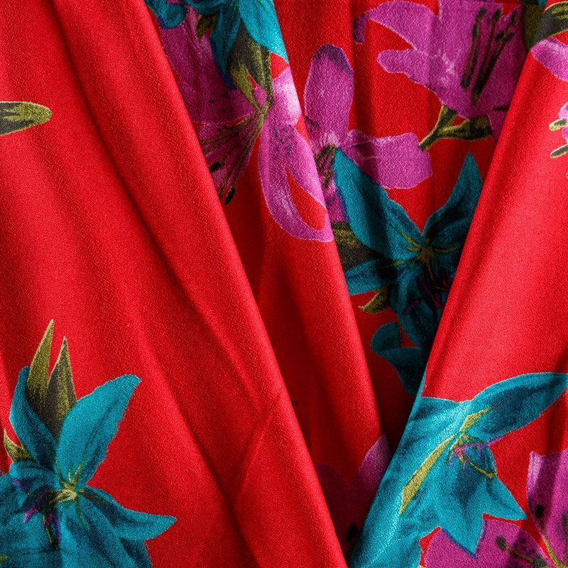 Плательно-блузочная вискозная ткань насыщенного красного оттенка с крупным цветочным принтом с креповым плетением. Ткань средней плотности, имеет зернистую фактуру и матовую поверхность, не просвечивает, пластичная, хорошо драпируется мягкими складками, струится. Подходит для пошива платья и сарафана, юбки, блузки, туники, топа, комбинезона.