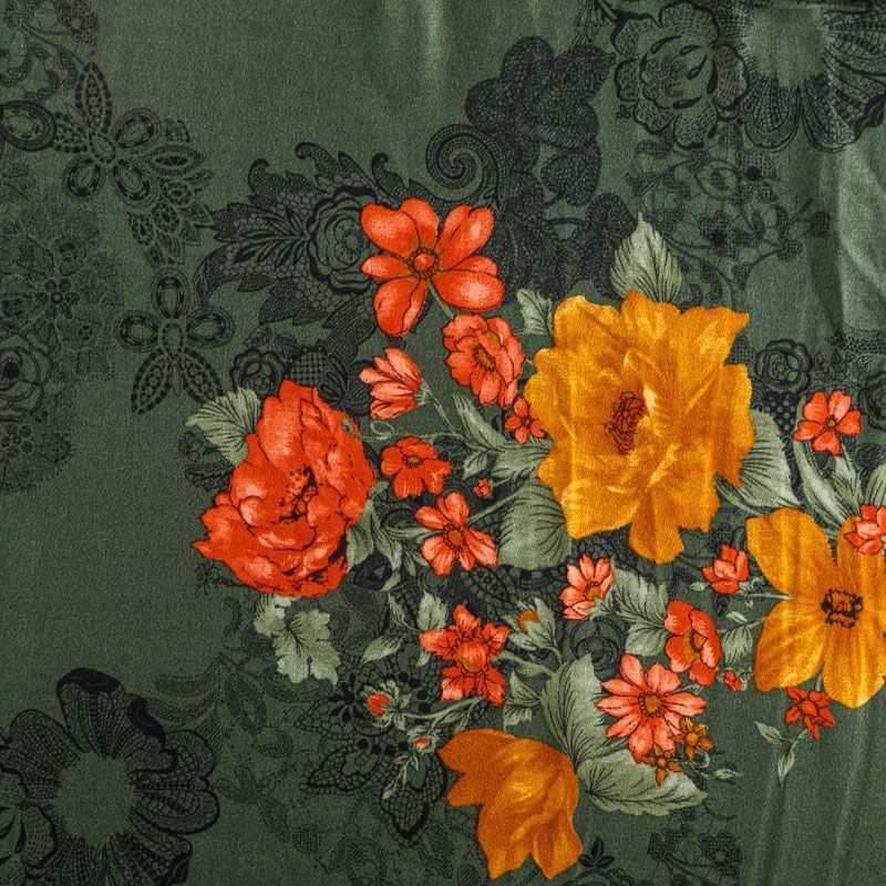 Плательно-блузочная вискозная ткань в холодном темно-зеленом оттенке с крупным цветочным принтом с креповым плетением. Ткань средней плотности, имеет зернистую фактуру и матовую поверхность, не просвечивает, пластичная, хорошо драпируется мягкими складками, струится. Подходит для пошива платья и сарафана, юбки, блузки, туники, топа, комбинезона.