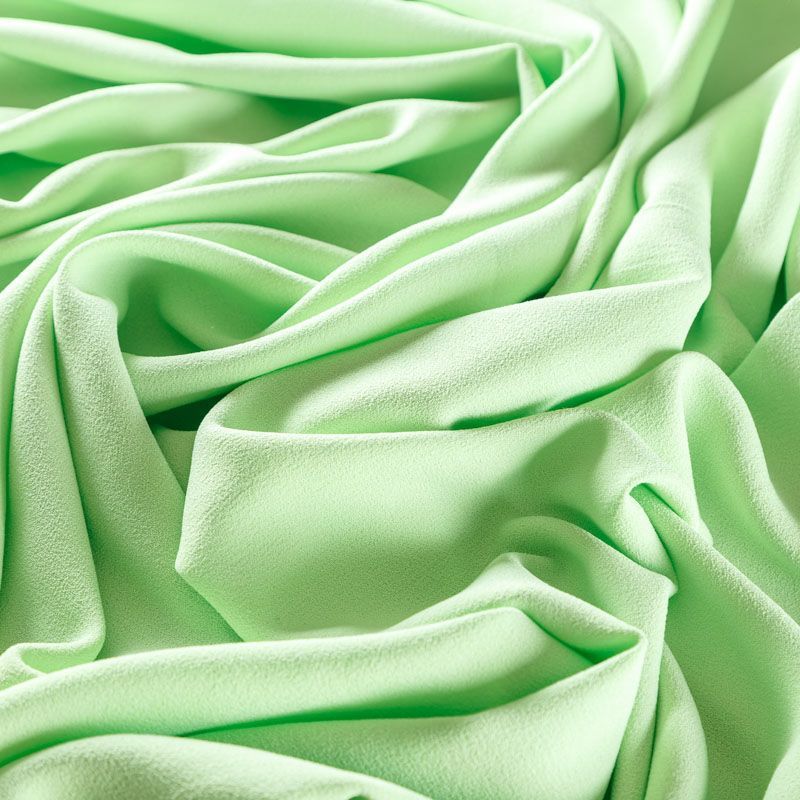 Итальянский вискозный креп костюмно-плательной плотности в салатовом оттенке. Ткань имеет зернистую фактуру и матовую поверхность, не просвечивает, пластичная, хорошо драпируется мягкими складками. Подходит для пошива костюма, платья, сарафана, юбки брюк, шорт, комбинезона.