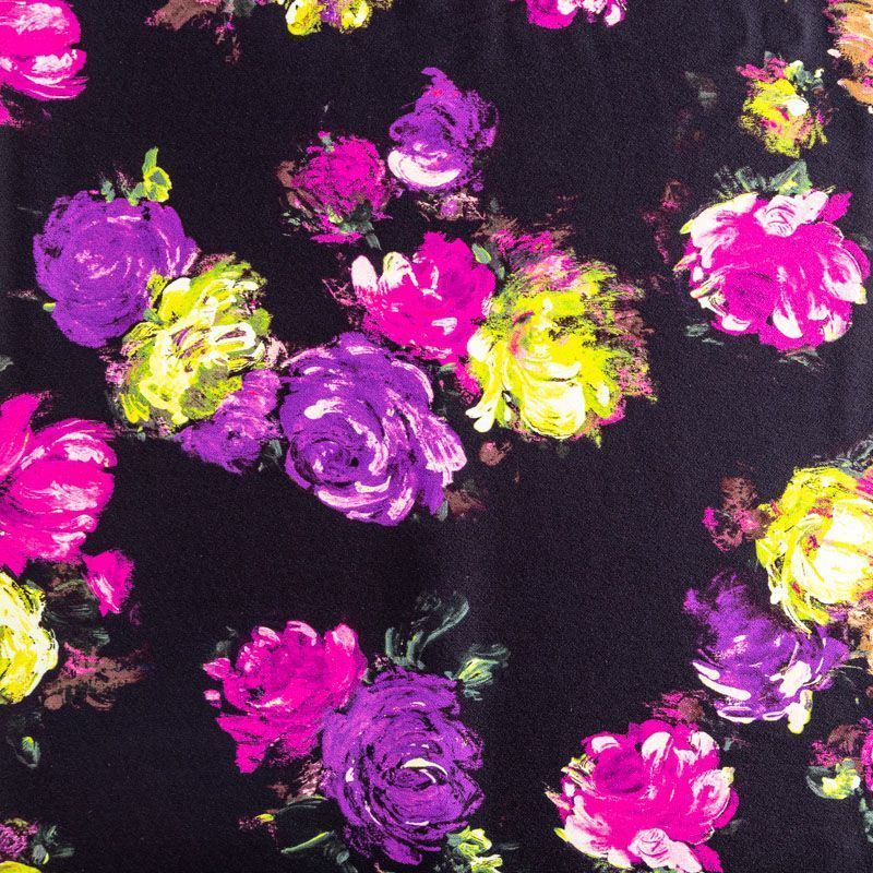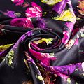 Итальянский вискозный креп-атлас плательной плотности глубокого черного цвета с ярким акцентным принтом. Поверхность имеет заметный блеск, на ощупь гладкая, приятная и упругая. Ткань малосминаемая, тянется за счет эластана в составе, красиво драпируется, струится и дает объемную складку, не просвечивает. Идеально подойдет для шикарного платья, блузы, юбки, комбинезона, брюк свободного кроя.