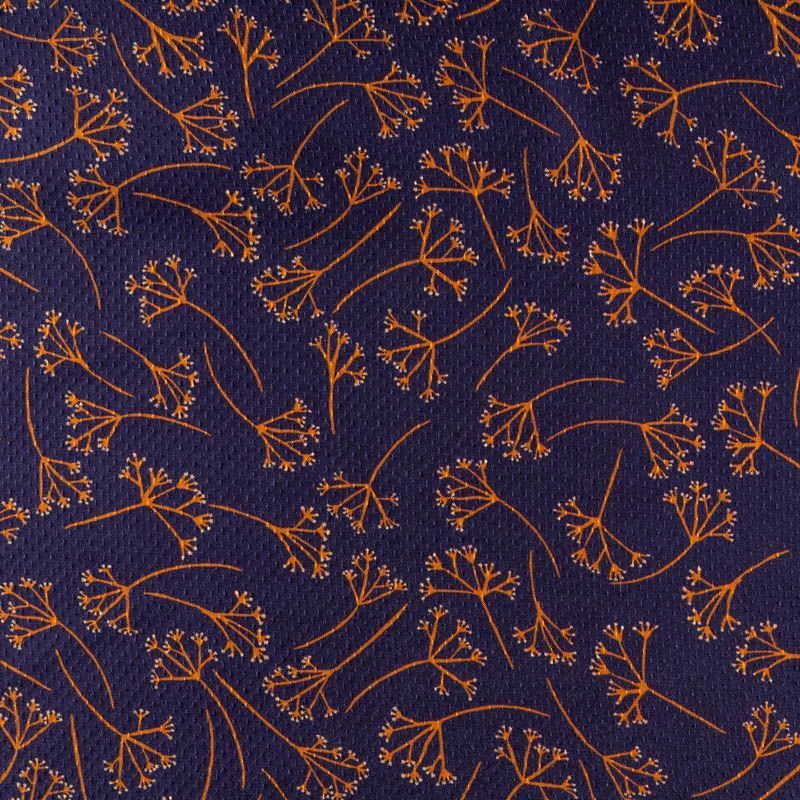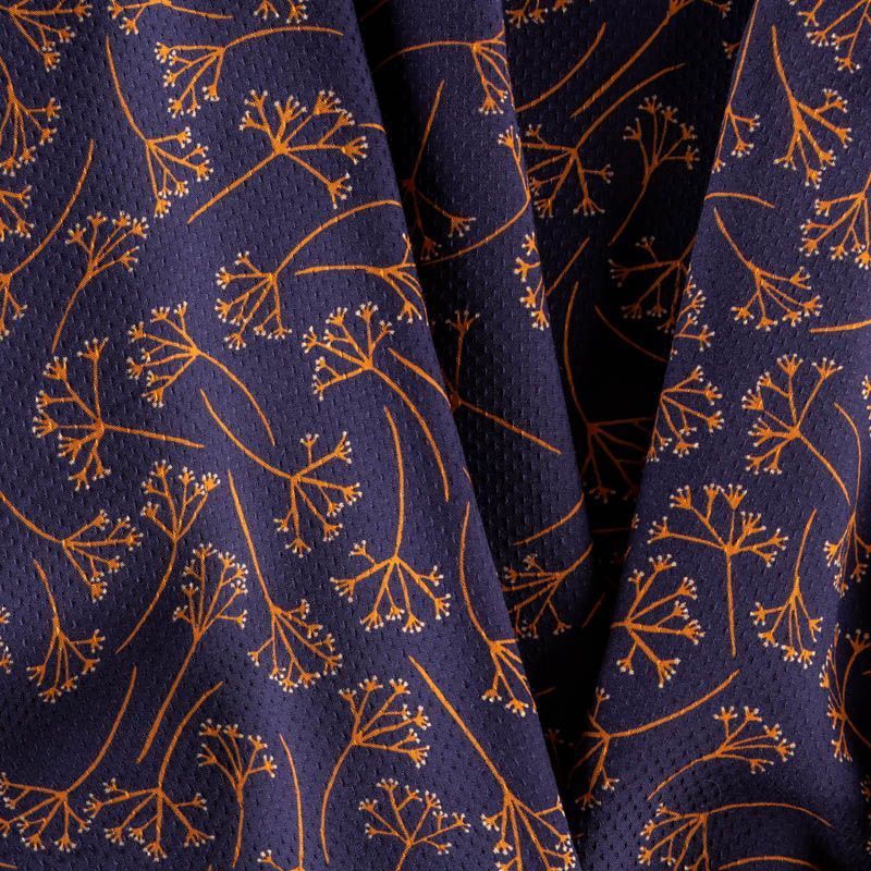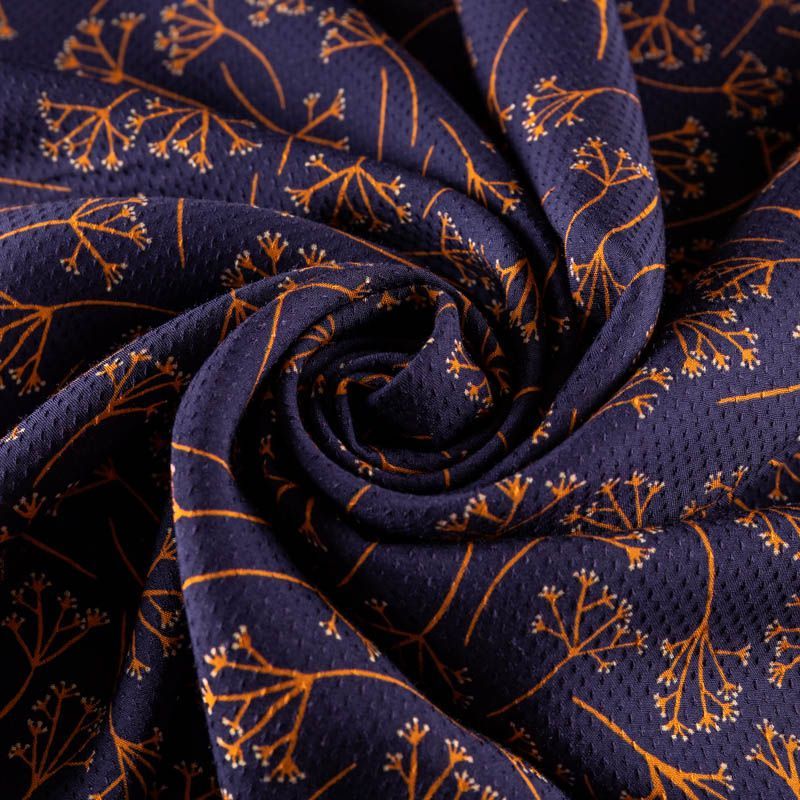 На глубоком фиолетово-синем фоне ненавязчивый растительный принт в оарнжевом цвете. Легкая, пластичная, шелковистая ткань с фактурным мелким узором. Не просвечивается. Мягкая, отлично драпируется и струится. Подойдет для пошива платья и сарафана, юбки, блузки, туники, топа, комбинезона с брюками или шортами, платье-халата.