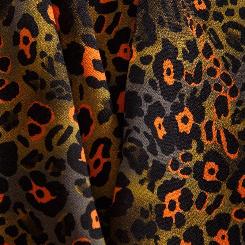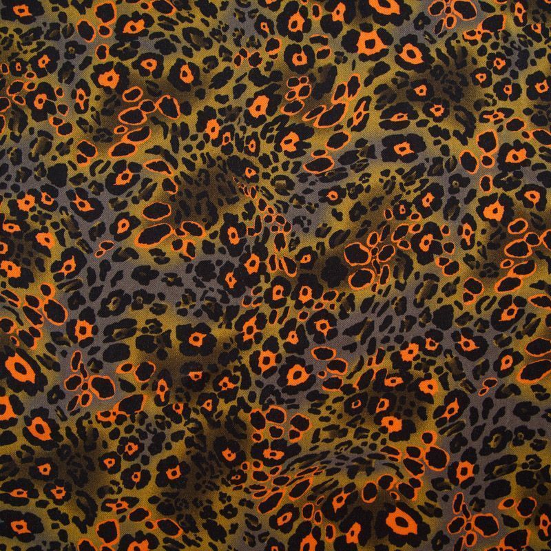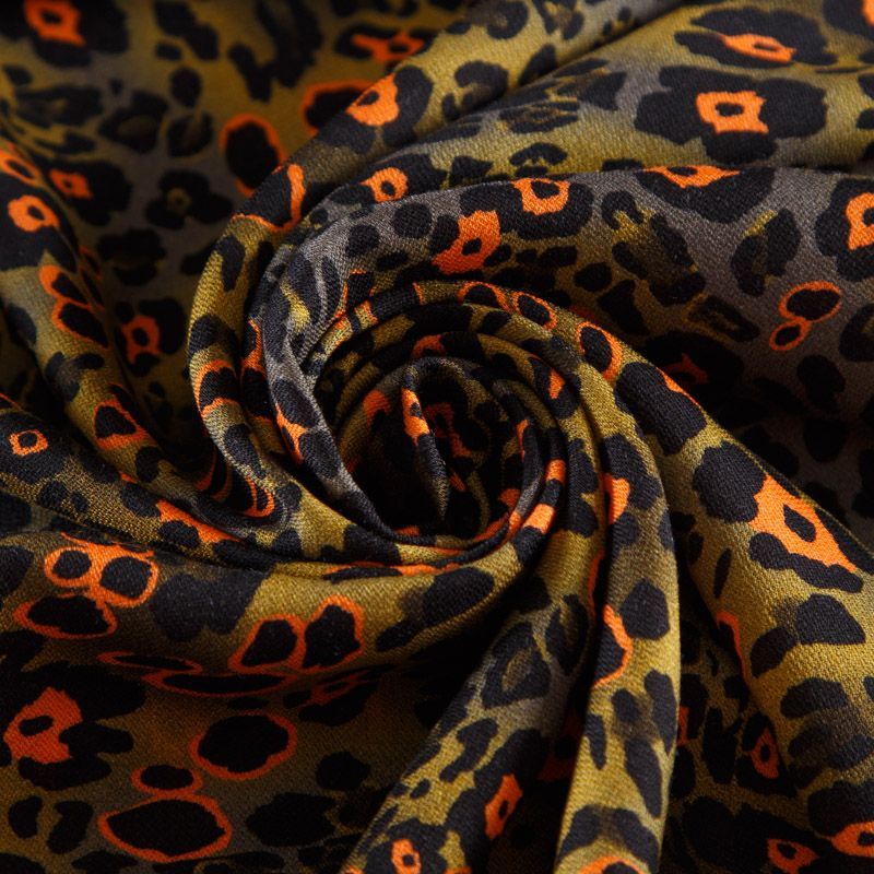 Итальянская натуральная вискозная ткань оливкового оттенка с анималистическим принтом. Ткань легкая, хорошо тянется, драпируется струящимися складками, приятная и комфортная в носке. Материал слегка мнется, имеет креповую фактуру. Идеально подходит для пошива  платьев, юбок, блуз, комбинезонов, костюмов, туник, кардиганов.