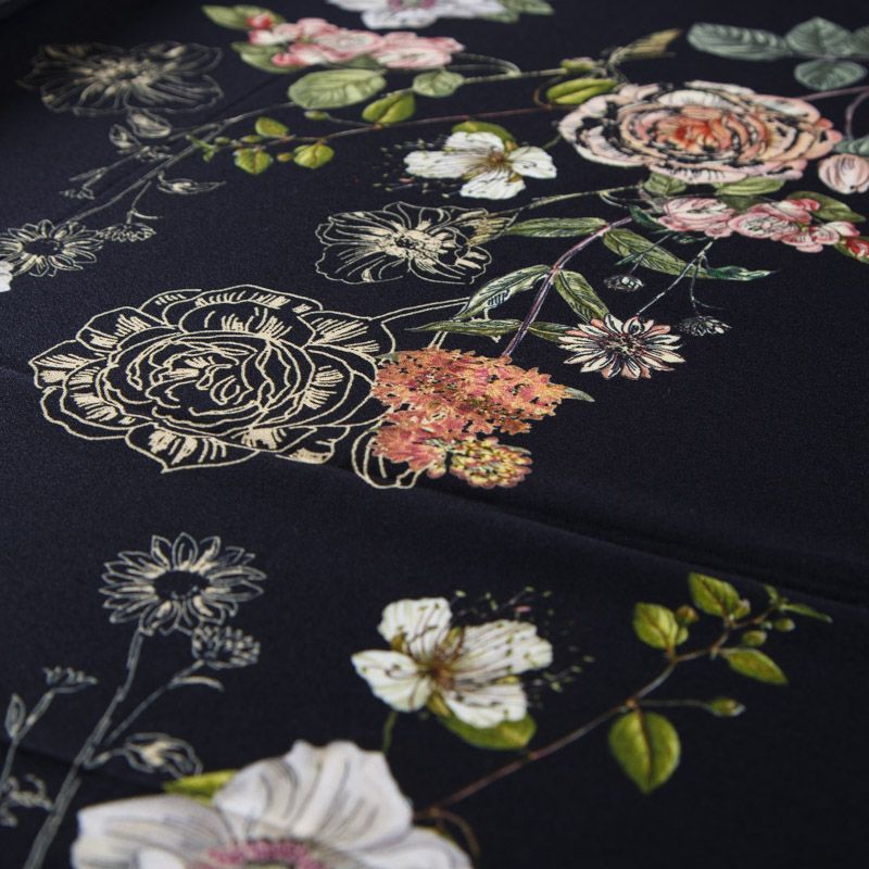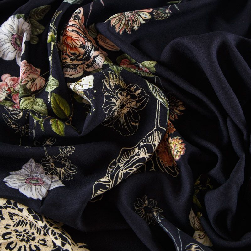 Итальянская натуральная вискозная ткань черного оттенка с растительным принтом. Ткань легкая, драпируется струящимися складками, приятная и комфортная в носке. Материал слегка мнется, имеет креповую фактуру. Идеально подходит для пошива  платьев, юбок, блуз, комбинезонов, костюмов, туник, кардиганов.