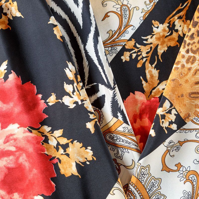 Натуральный шелковый крепдешин с матовой поверхностью, легкий, струящийся, хорошо драпируется. Оригинальный насыщенный принт выполнен в монохромной гамме в добавлением ярких цветовых акцентов. Крепдешин прекрасно подойдет для пошива летнего сарафана, платья, топа, блузки, костюма в пижамном стиле, широких брюк или юбки.