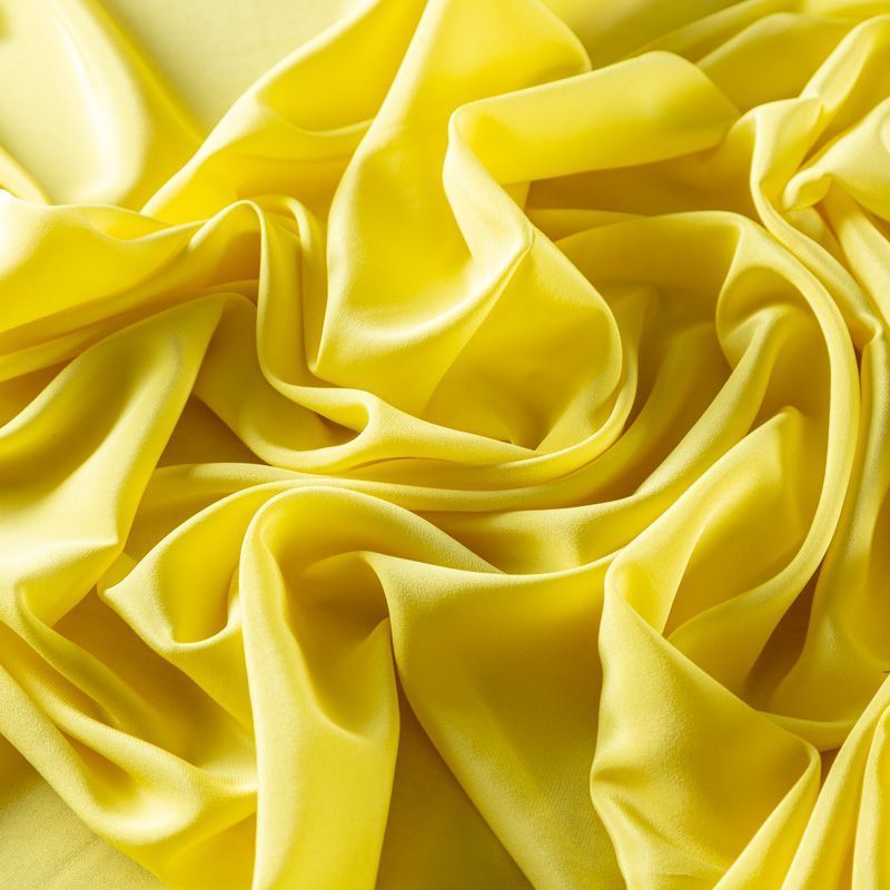 Итальянский натуральный шелковый крепдешин в желтом оттенке, фактурный, легкий и струящийся, слегка просвечивает, отлично драпируется. Идеально подойдет для пошива платьев и сарафанов расклешенных моделей, с воланами, летящих юбок, топов, блузки, юбки, широких брюк, костюма в пижамном стиле.