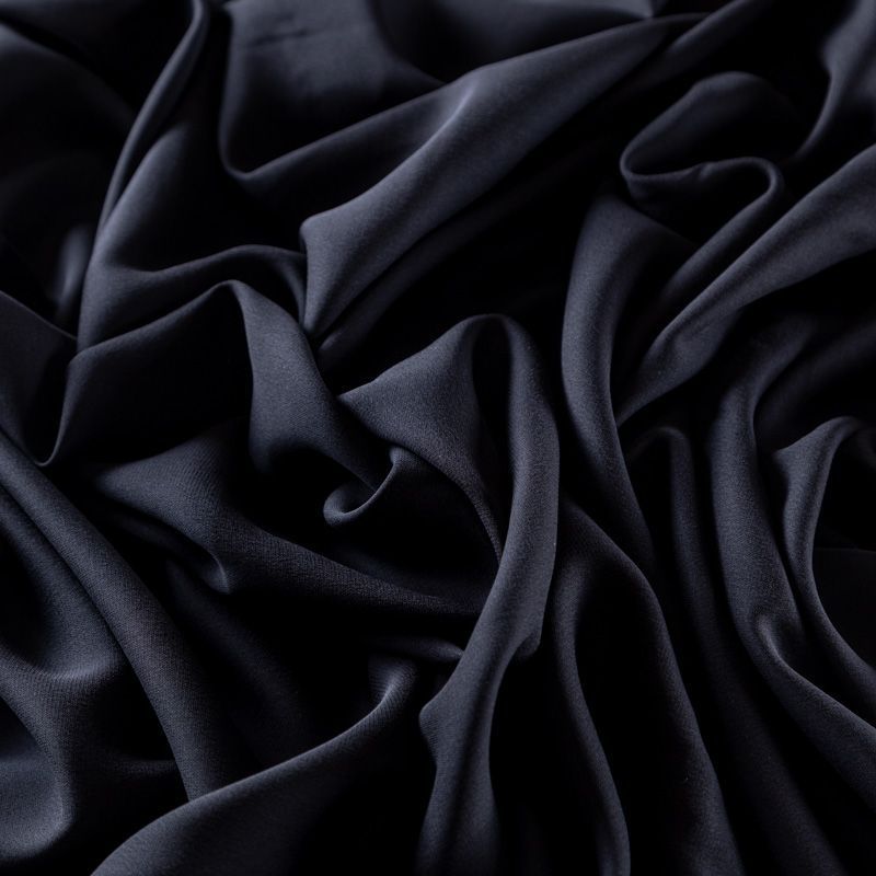 Итальянский натуральный шелковый крепдешин в черном оттенке, фактурный, легкий и струящийся, слегка просвечивает, отлично драпируется, тянется за счет эластана в составе. Идеально подойдет для пошива платьев и сарафанов расклешенных моделей, с воланами, летящих юбок, топов, блузки, юбки, широких брюк, костюма в пижамном стиле.