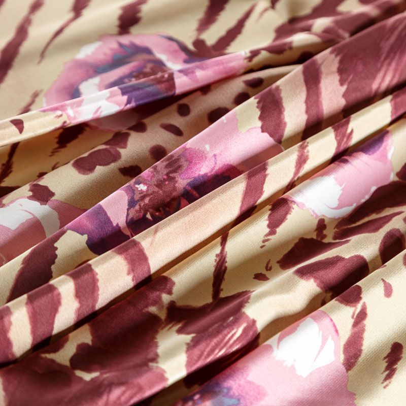 Натуральный шелковый крепдешин с матовой поверхностью, легкий, струящийся, хорошо драпируется, не просвечивает. Оригинальный принт сочетает анималистический и цветочный узоры и выполнен в приглушенном сливовом оттенке, который прекрасно подойдет для пошива летнего сарафана, платья, блузки, костюма в пижамном стиле, широких брюк или юбки.