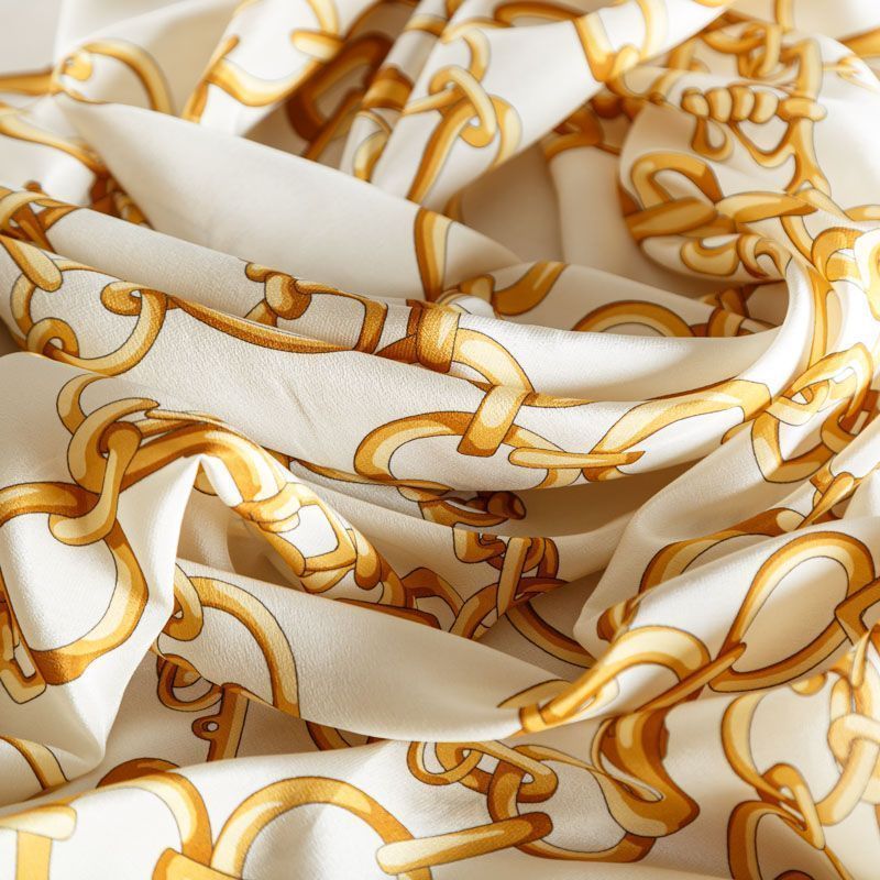 Итальянский натуральный крепдешин в молочном оттенке с золотыми цепочками, тонкий, слегка прозрачный, отлично драпируется, легкий и струящийся. Идеально подойдет для пошива платьев и сарафанов расклешенных моделей, с воланами, летящих юбок, топов, блузки, юбки, широких брюк, костюма в пижамном стиле.