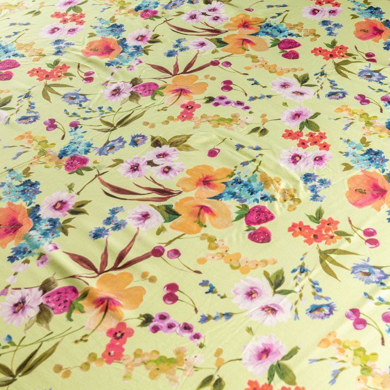Натуральный шелковый крепдешин с добавлением хлопка с матовой поверхностью, легкий, струящийся, хорошо драпируется. Ткань немного просвечивает, хорошо тянется за счет эластана в составе. Яркий ягодно-цветочный принт на салатовом фоне прекрасно подойдет для пошива летнего сарафана, платья, блузки, костюма в пижамном стиле, широких брюк или юбки.