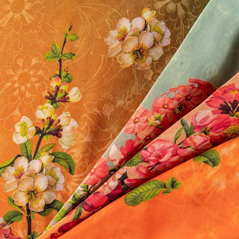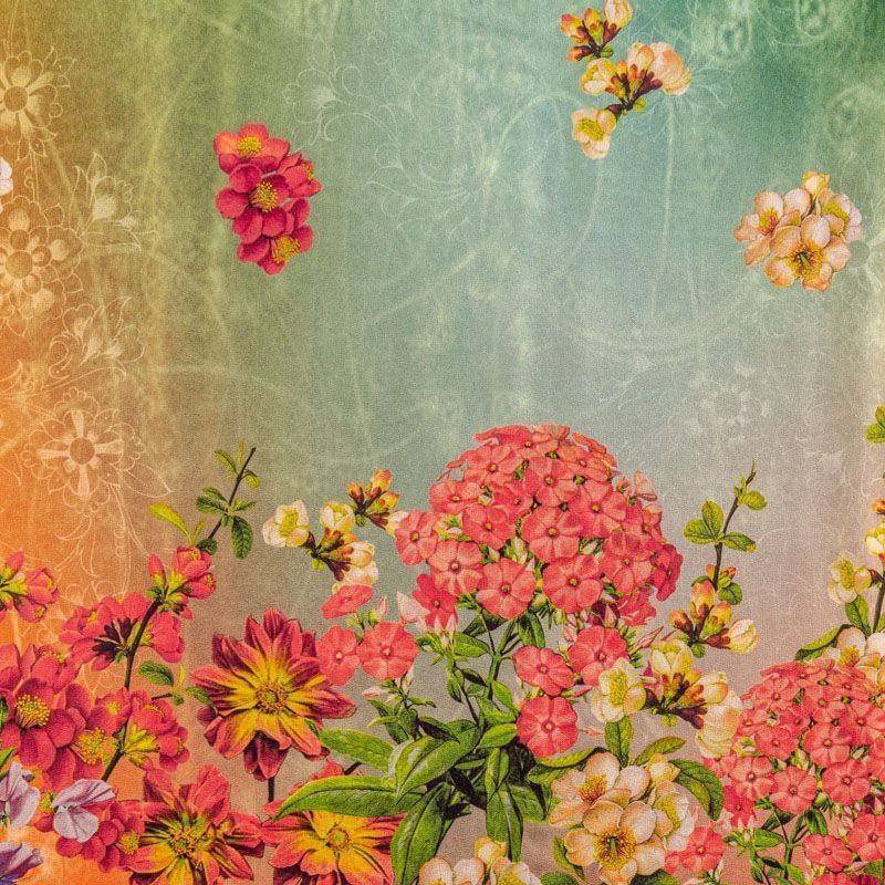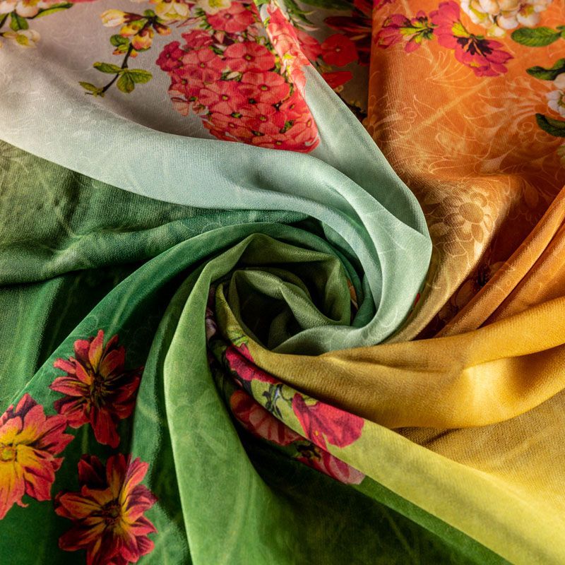 Натуральный шелковый крепдешин с эффектом деграде с плавным переходом от кораллового до ярко-зеленого цвета, дополненный по кромке цветочным принтом, подойдет для ценителей ярких образов. Ткань имеет матовую поверхность, легкая, тонкая, струящаяся, хорошо драпируется, набирается объемом. Будет идеальна для пошива летнего сарафана, платья, блузки, костюма в пижамном стиле, широких брюк или юбки.