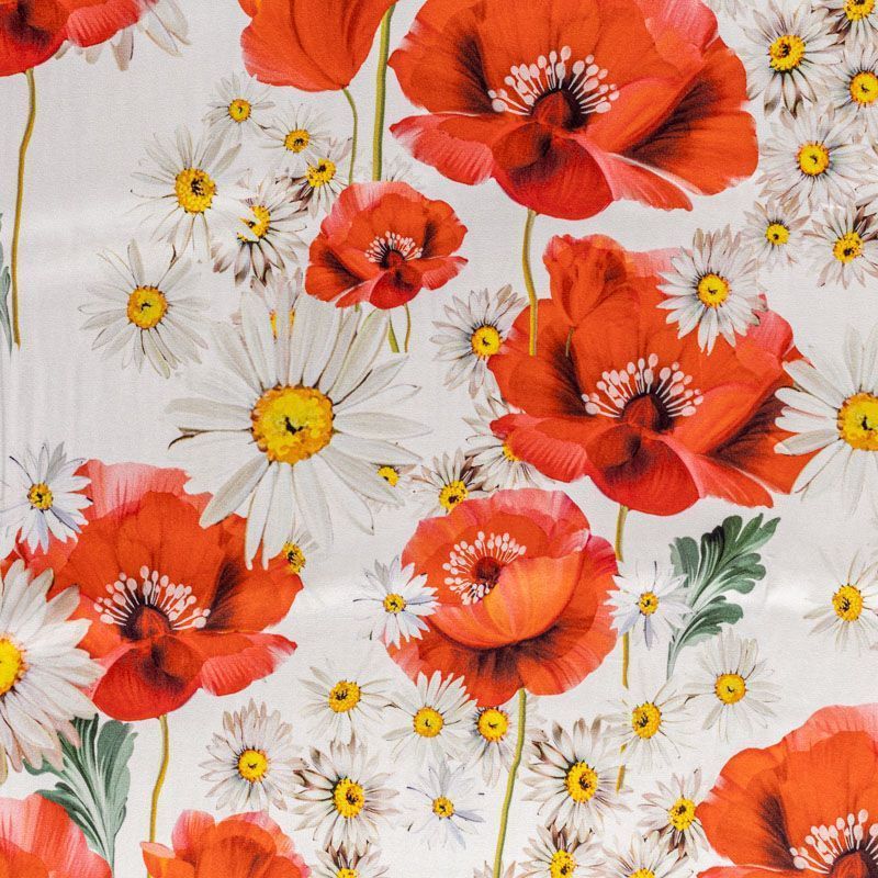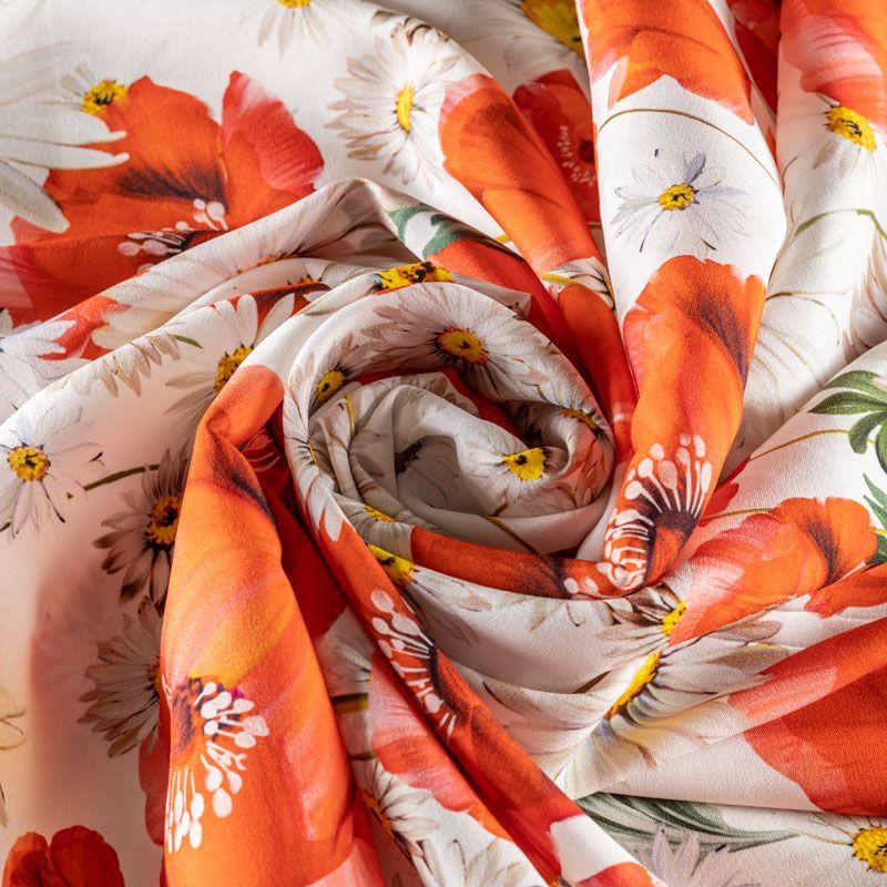 Натуральный шелковый крепдешин с матовой поверхностью, легкий, струящийся, хорошо драпируется, тянется за счет эластана в составе. Яркий летний цветочный принт, актуальный в этом сезоне, будет уместен для пошива летнего сарафана, платья, блузки, костюма в пижамном стиле, широких брюк или юбки.