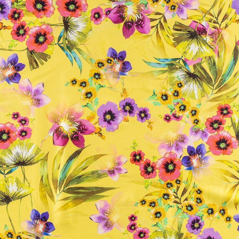 Натуральный шелковый крепдешин с матовой поверхностью, легкий, струящийся, хорошо драпируется, тянется за счет эластана в составе. Цветочный принт выполнен в ярких актуальных оттенках, который будет уместен для пошива летнего сарафана, платья, блузки, костюма в пижамном стиле, широких брюк или юбки.