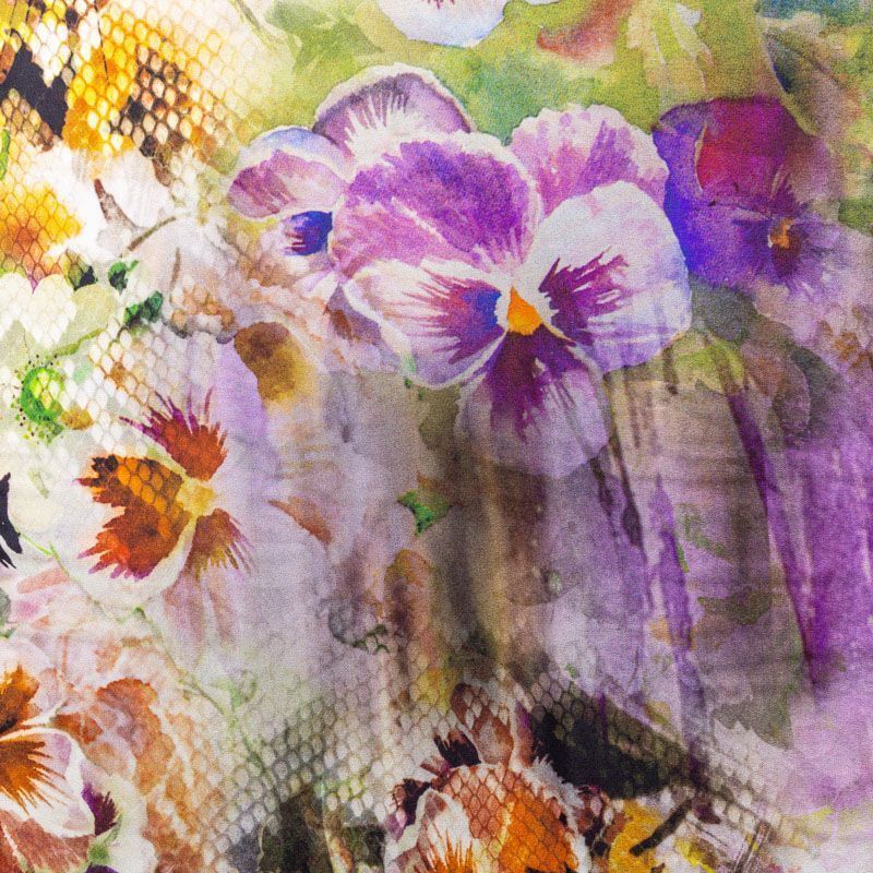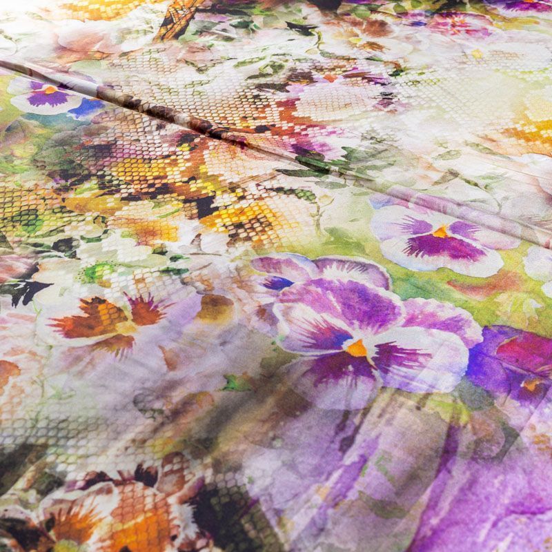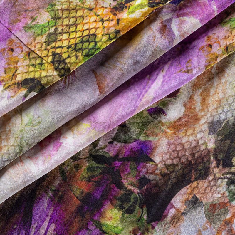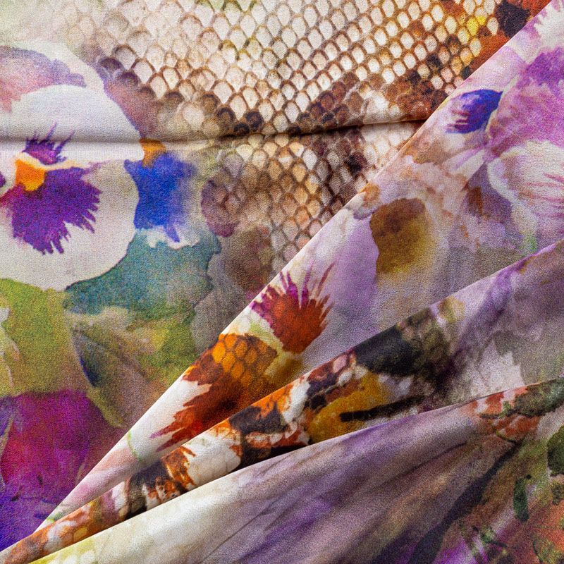 Натуральный шелковый крепдешин с матовой поверхностью, легкий, струящийся, хорошо драпируется, провсечивает. Цветочный принт выполнен в акварельной технике с элементами анималистической темы. Крепдешин прекрасно подойдет для пошива летнего сарафана, платья, блузки, костюма в пижамном стиле, широких брюк или юбки.