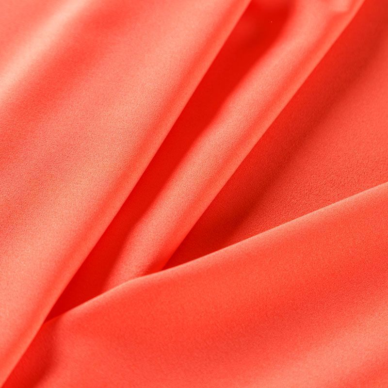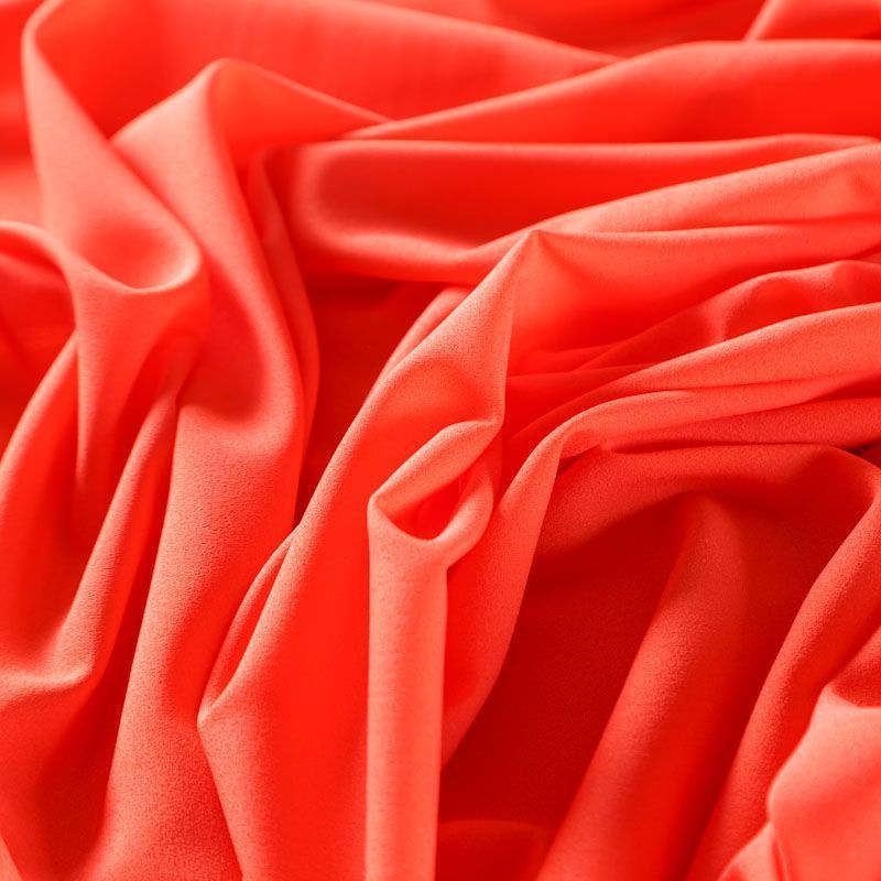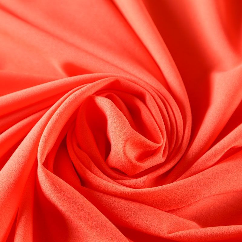 Крепдешин яркого красно-оранжевого оттенка, тонкий, легкий, фактурный, приятный на ощупь. Очень пластичный, тянется за счет эластана в составе, прекрасно драпируется и струится. Ткань слегка просвечивает, можно использовать подклад. Идеально будет смотреться в платье, юбке, тунике, рубашке или блузке.