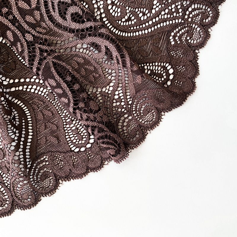Эластичное кружево сочетает в себе мягкость, прочность и красоту, благодаря своей упругости оно долго не теряет первоначальную форму. Используется для пошива нижнего белья, а так же применяется как отделочный декор в одежде.