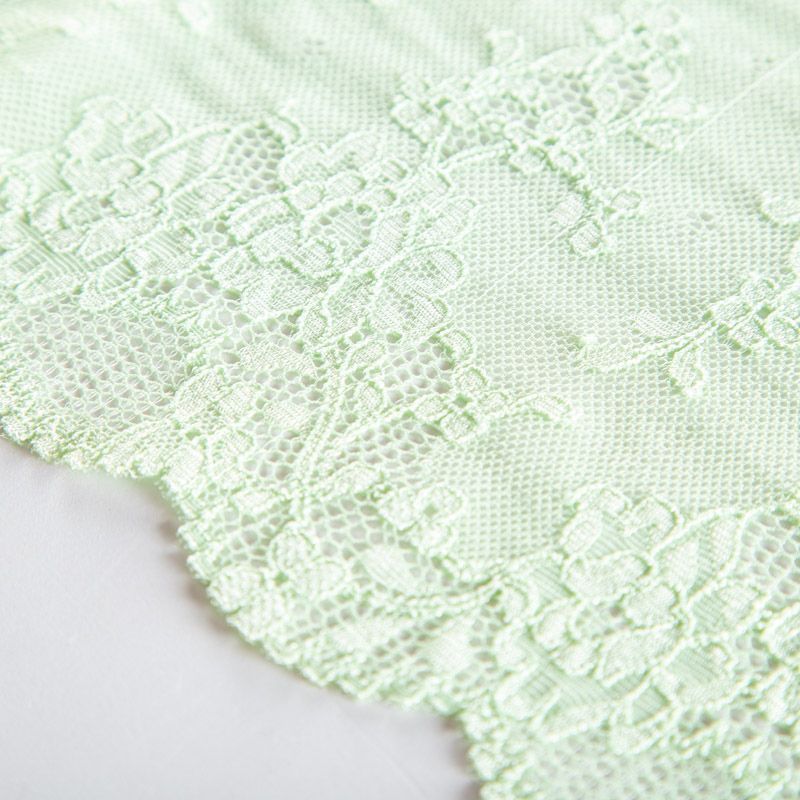 Эластичное кружево сочетает в себе мягкость, прочность и красоту, благодаря своей упругости оно долго не теряет первоначальную форму. Используется для пошива нижнего белья, а так же применяется как отделочный декор в одежде.