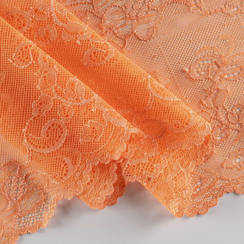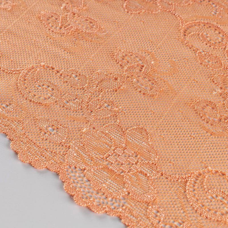 Эластичное кружево сочетает в себе мягкость, прочность и красоту, благодаря своей упругости оно долго не теряет первоначальную форму. Используется для пошива нижнего белья, а так же применяется как отделочный декор в одежде.