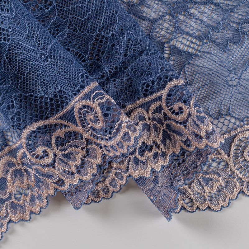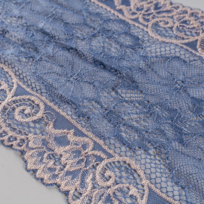 Эластичное кружево сочетает в себе мягкость, прочность и красоту, благодаря своей упругости оно долго не теряет первоначальную форму. Используется для пошива нижнего белья, а так же применяется как отделочный декор в одежде.