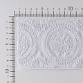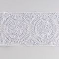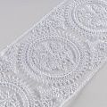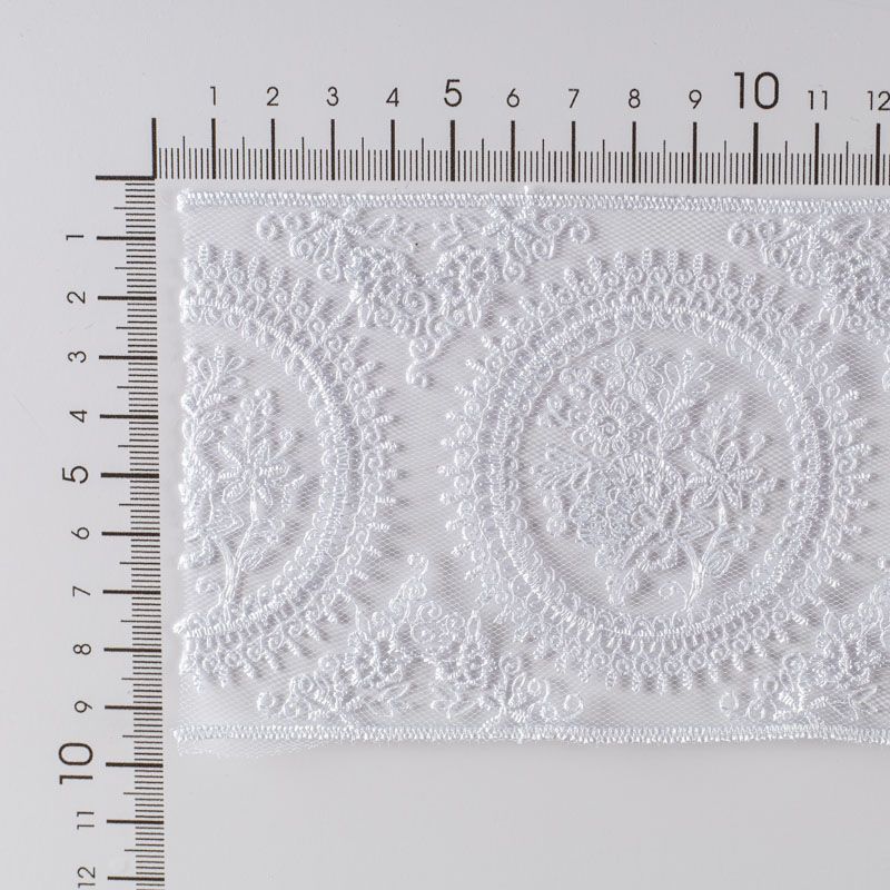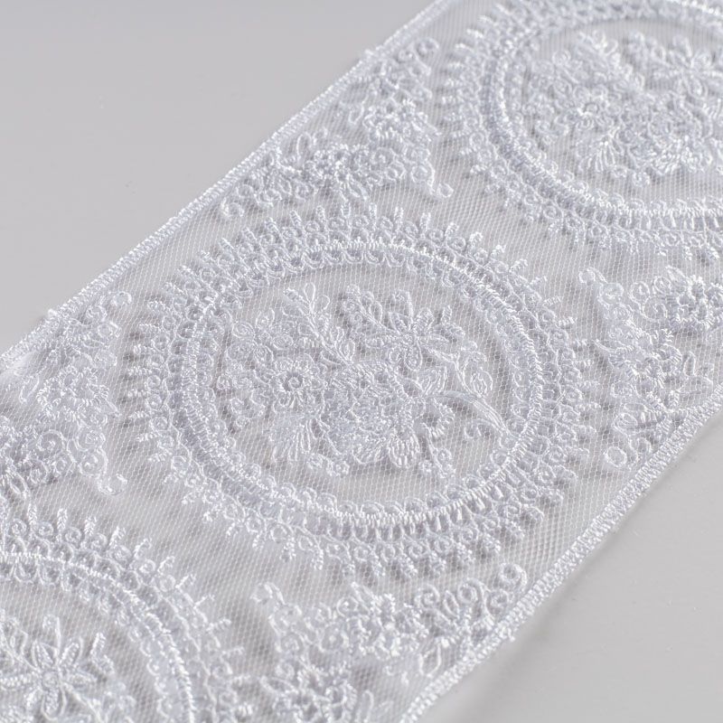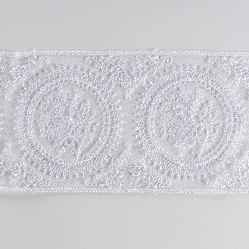 Белое кружево на сетке представляет собой кружевное полотно, основа которого сетка или фатин. Применяется для декоративной отделки лёгкой женской одежды и домашнего текстиля. Края фигурные, обработаны с двух сторон.