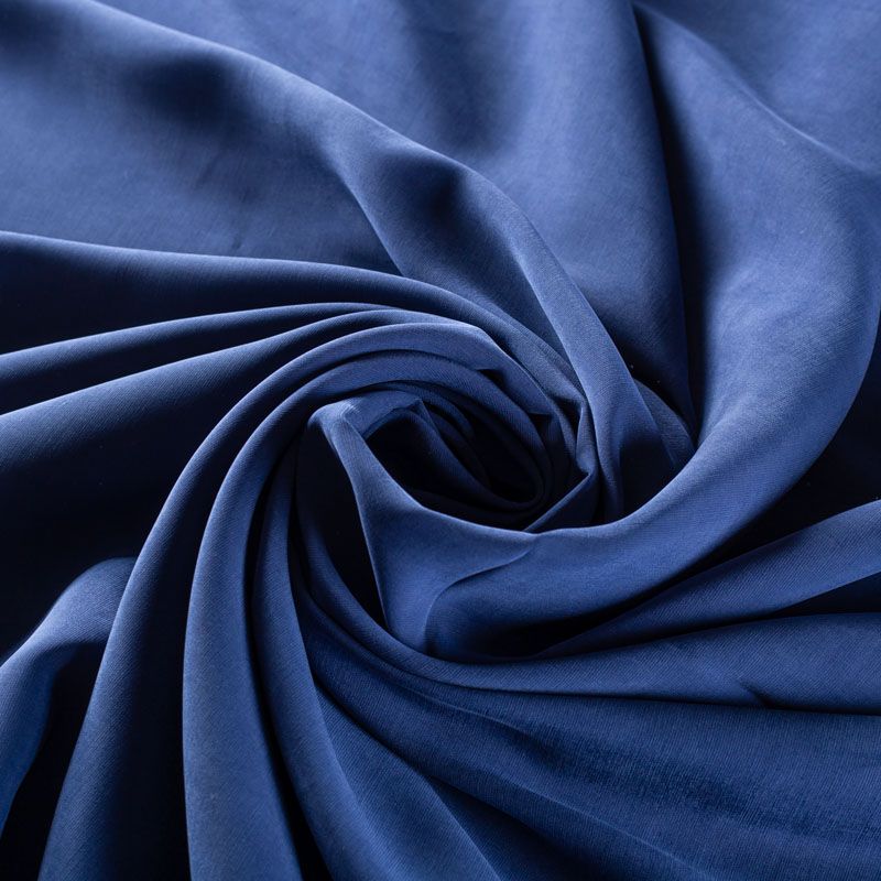 Купро плательно-костюмной плотности припыленного темно-синего оттенка. Ткань мягкая, пластичная, струящаяся, отлично драпируется, не просвечивает. Поверхность ткани бархатистая, похожа на мокрый шелк. Идеально подойдет для платьев свободного силуэта, брюк-палацио, юбок, шорт, туник, платья-рубашки, блузы.