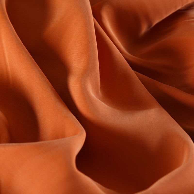 Итальянская купро плательно-костюмной плотности темно-оранжевого оттенка. Ткань мягкая, пластичная, струящаяся, отлично драпируется, не просвечивает. Поверхность ткани бархатистая, похожа на мокрый шелк. Идеально подойдет для платьев свободного силуэта, брюк-палацио, юбок, шорт, туник, платья-рубашки, блузы.