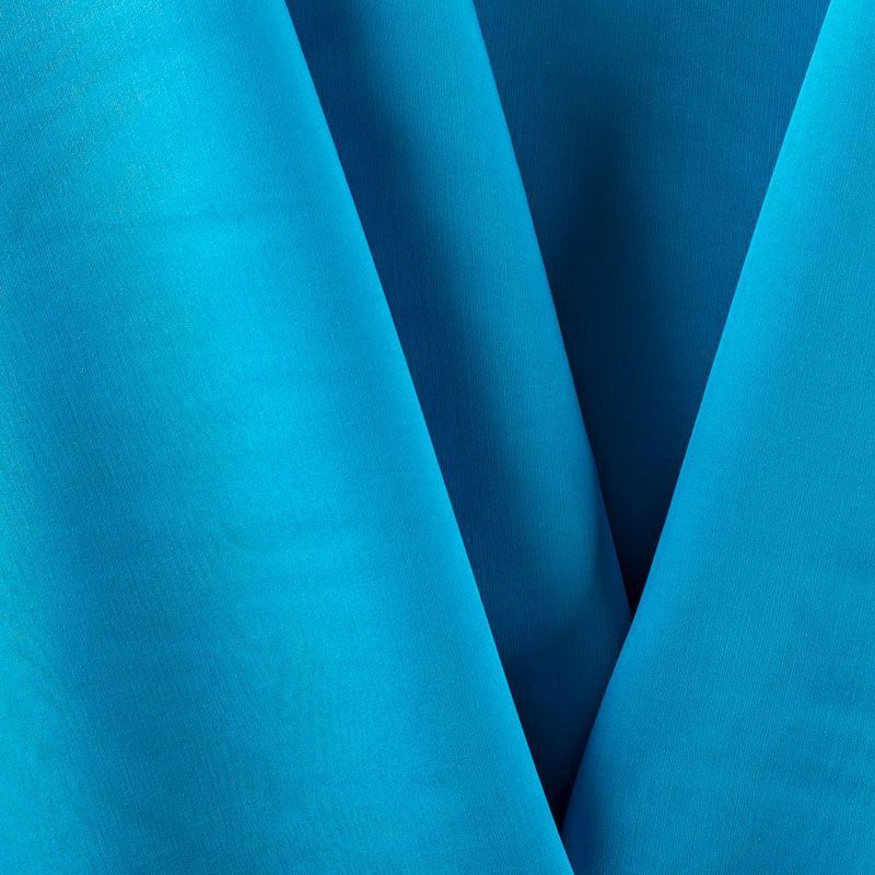 Купро плательно-костюмной плотности лазурно-голубого оттенка. Ткань мягкая, пластичная, струящаяся, отлично драпируется, не просвечивает. Поверхность ткани бархатистая, похожа на мокрый шелк. Идеально подойдет для платьев свободного силуэта, брюк-палацио, юбок, шорт, туник, платья-рубашки, блузы.