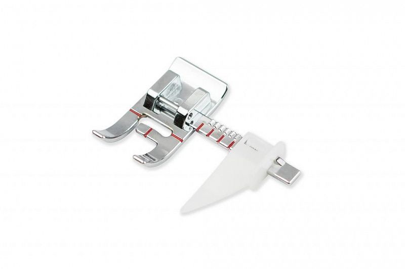 Лапка используется для шитья с отступом от края ткани до 27мм, а также для выполнения параллельных строчек. Направитель позволяет регулировать и задавать расстояние между строчками. Лапка совместима с любыми швейными машинами с шириной зигзага не более 7 мм: