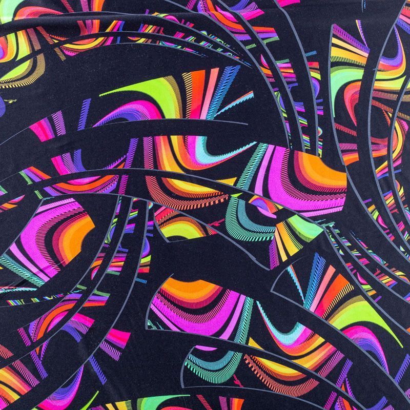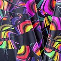 Итальянский бифлекс с ярким абстрактным принтом. Поверхность ткани матовая и гладкая. Отлично тянется, одежда из него не сковывает движения. Хорошо впитывает влагу и быстро высыхает, не вызывет аллергии и раздражения. Используется для пошива эстрадных, спортивных костюмов, купальников, боди.