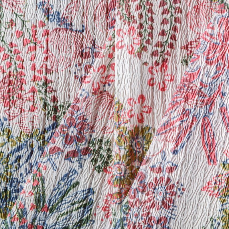 Итальяская качественная, красивая и приятная на ощупь лайкра молочного оттенка в фантазийным цветочным принтом. Поверхность ткани матовая, с жаккардовой фактурой и псевдоперфорацией.  Идеально облегает фигуру, тянется по двум направлениям, хорошо драпируется, отлично держит форму, устойчива к пилингу, долговечна и гигроскопична. Используется для пошива одежды для танцев, гимнастики, фигурного катания, для велоспорта, легкой атлетики и аэробики, фитнеса и других видов спорта, для купальников, женского белья, театральных, цирковых и эстрадных костюмов.