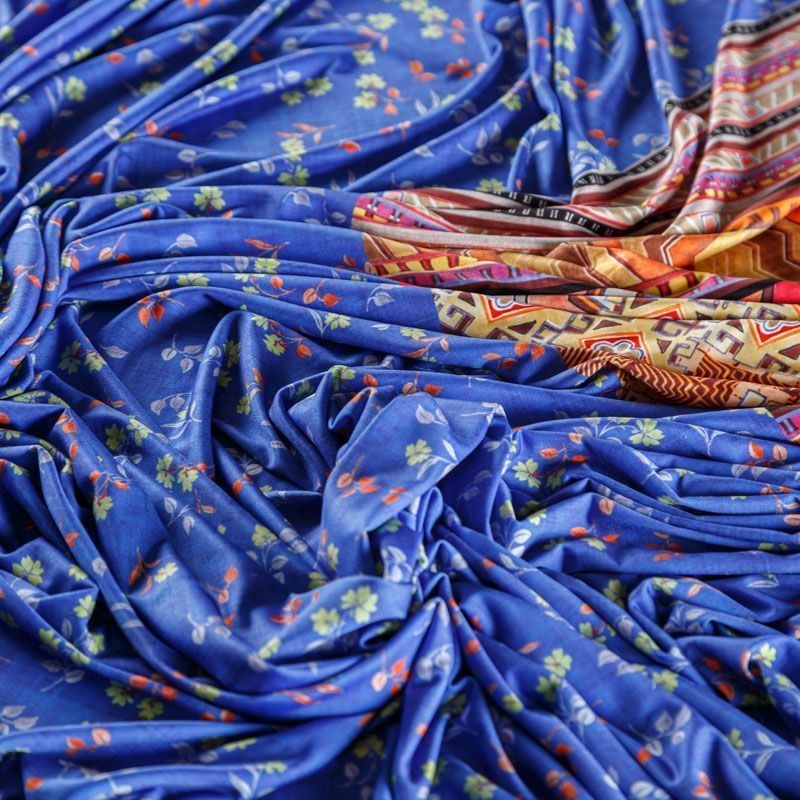 Итальяская качественная, красивая и приятная на ощупь купонная лайкра ярко-синего оттенка с цветочным принтом. Поверхность ткани матовая и гладкая.  Идеально облегает фигуру, тянется по двум направлениям, хорошо драпируется, отлично держит форму, устойчива к пилингу, долговечна и гигроскопична. Используется для пошива одежды для танцев, гимнастики, фигурного катания, для велоспорта, легкой атлетики и аэробики, фитнеса и других видов спорта, для купальников, женского белья, театральных, цирковых и эстрадных костюмов.