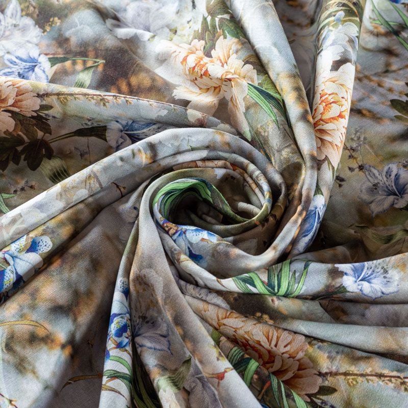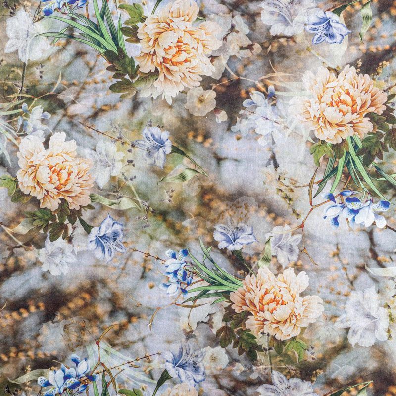 Льняная плательно-рубашечная ткань с добавлением бемерии в серых оттенках с реалистичным цветочным фотопринтом. Материал прочный, с выразительной матовой рельефной поверхностью, полотняным плетением, хорошо держит форму, мягкий на ощупь, пластичный, отлично драпируется. Прекрасно подойдет для пошива летних платьев, сарафанов, юбок, рубашек, брюк и шорт.