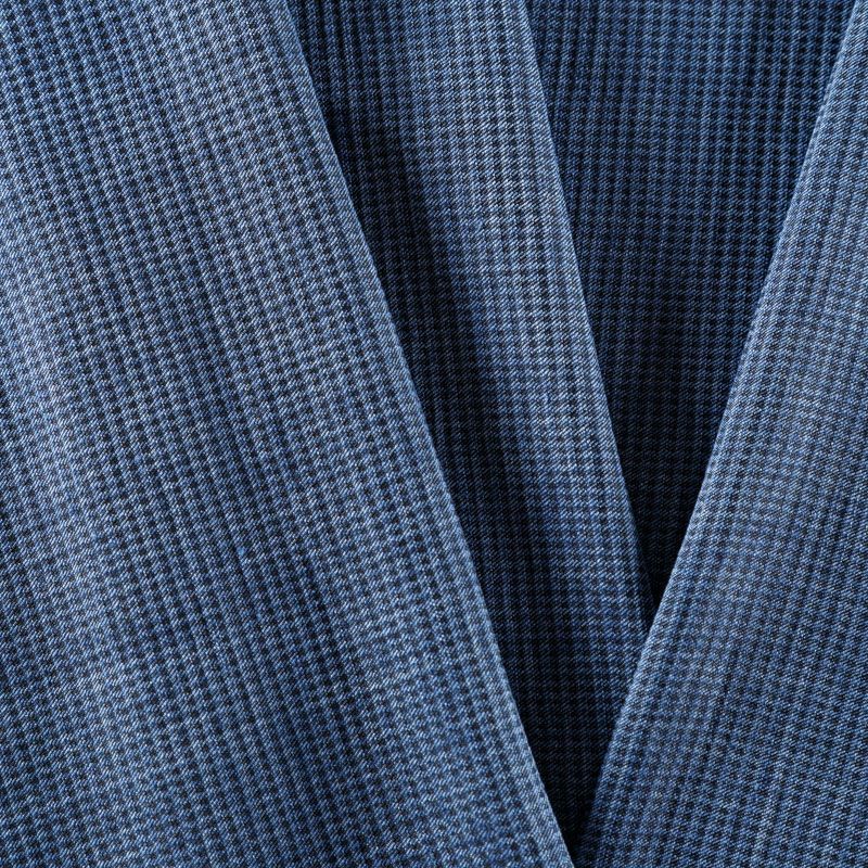 Итальянский костюмно-плательный лен синего оттенка в мелкую клеточку. Ткань прочная, имееет на ощупь приятную, гладкую поверхность, а визуально - выраженный рельеф и полотняное переплетение, держит форму, пластичная, мнется не сильно благодаря добавлению ацетата в состав материала. Подойдет для пошива костюмов, брюк, шорт, в том числе мужских, юбок, платьев, сарафанов, топов, комбинезонов, жакетов, кардиганов.
