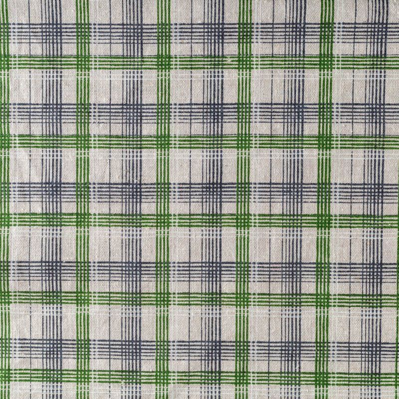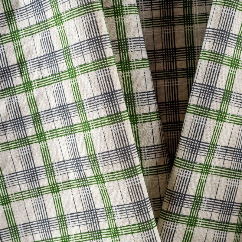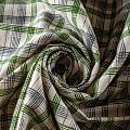 Прочный, выразительная матовая рельефная поверхность, полотняное переплетение, хорошо держит форму, жестковатый на ощупь,сложно драпируется. Прекрасно подойдет для пошива летних жакетов, жилетов, брюк и шорт. Сочетание линий черного, зеленого и белого цветов образует сложную красивую клетку.