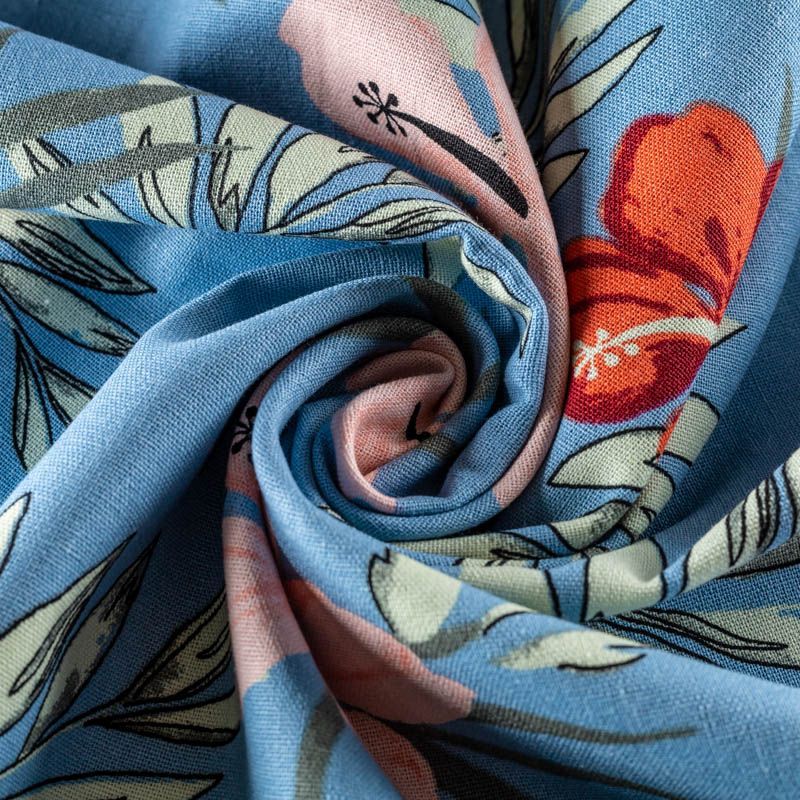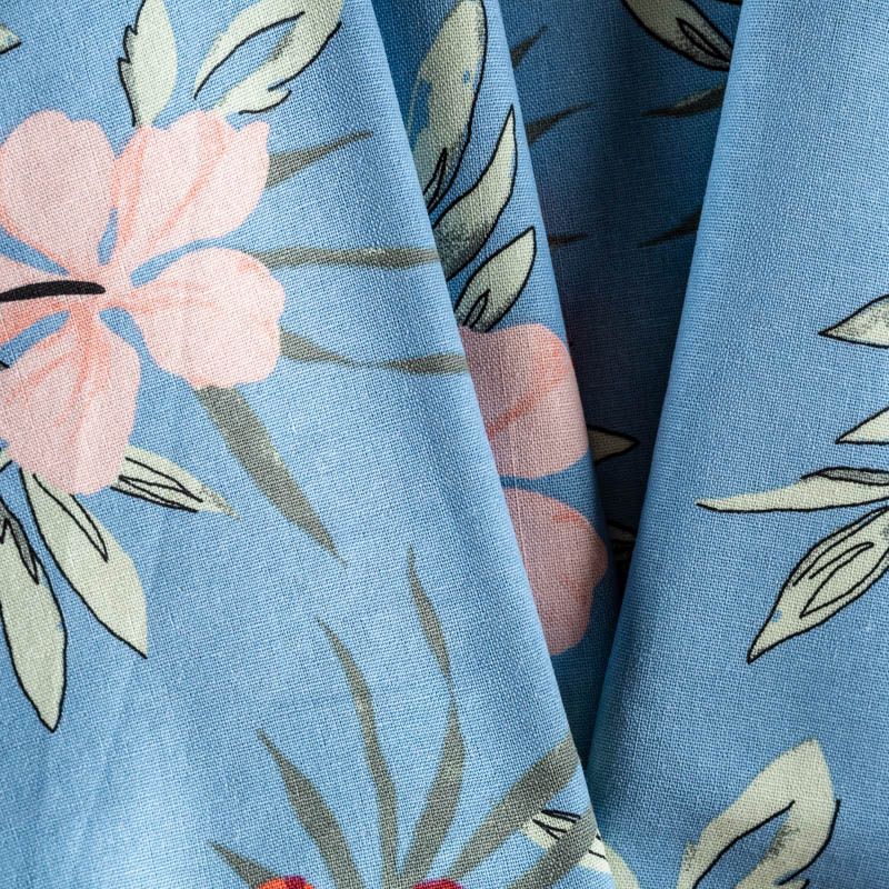 Прочный, выразительная матовая рельефная поверхность, полотняное переплетение, отлично держит форму, жестковатый на ощупь, но комфортный в изделии. Стильный вариант для платьев-футляров, сарафанов, юбок, жакетов, брюк или шорт. Льняная костюмно-плательная ткань с крупным цветочным принтом красно-коралловых оттенков на голубом фоне.