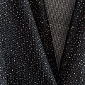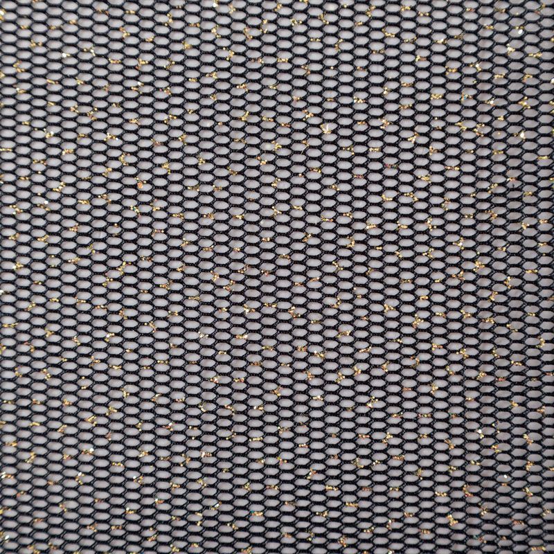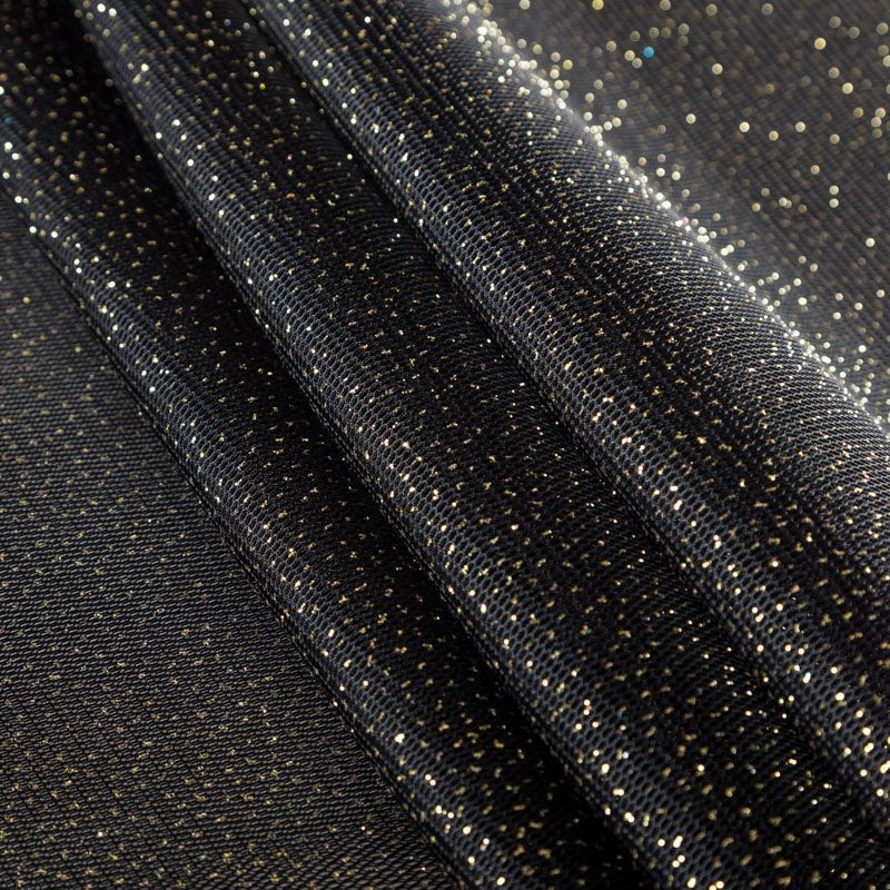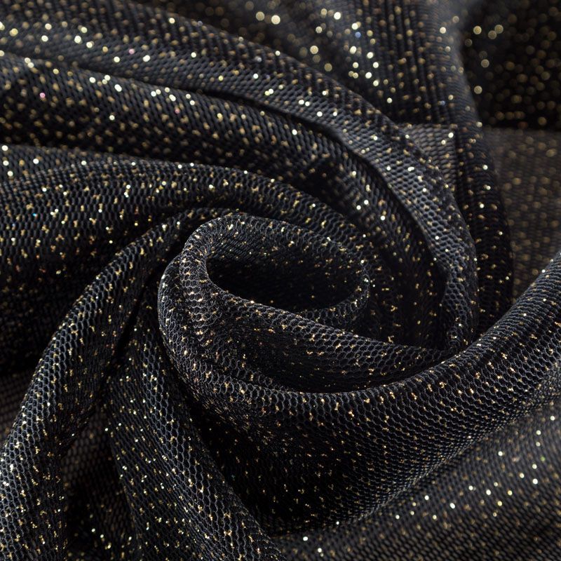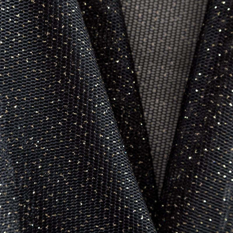 Объемный, эластичный материал черного цвета с золотистым напылением, состоящий из двойной мелкой сетки, по форме напоминающей соты. Упругое, мягкое с полупрозрачной фактурой полотно, пластичное и довольно прочное. Хорошо тянется, легкое и комфортное. Отлично держит форму. Рекомендуется для пошива объемных изделий или элементов: эксклюзивного жакета, бомбера, платья, юбки.