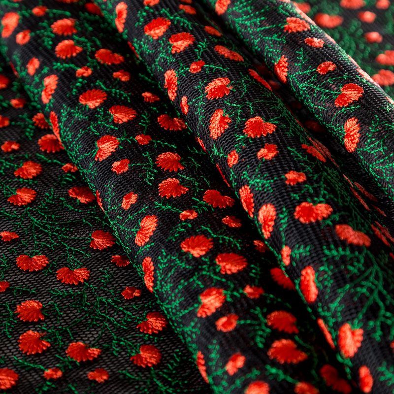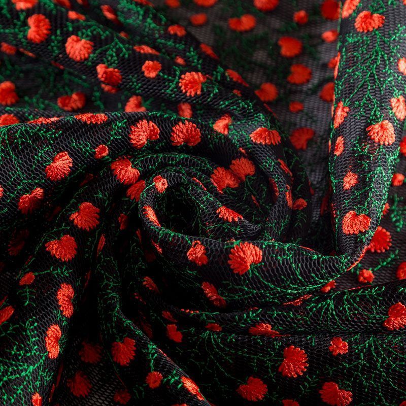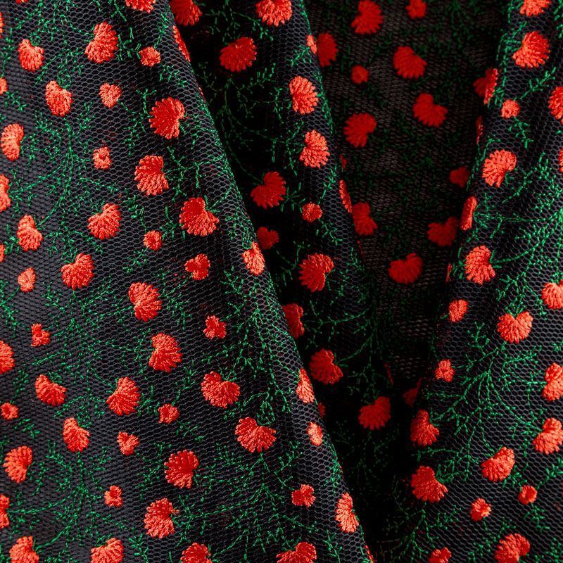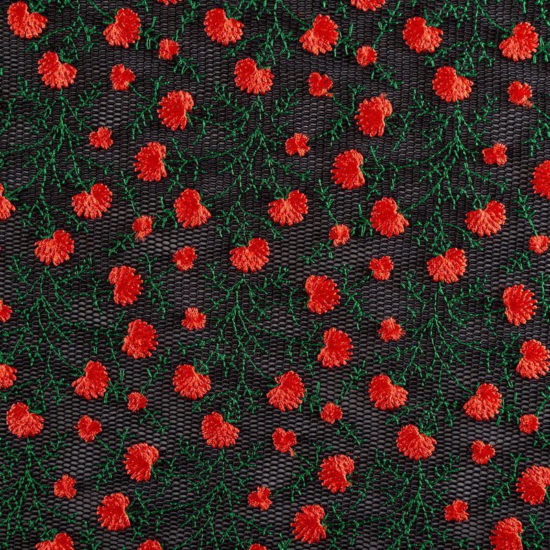 Объемный, эластичный материал черного цвета, состоящий из двойной мелкой сетки, по форме напоминающей соты, украшенный "богатой" цветочной вышивкой. Упругое, мягкое с полупрозрачной фактурой полотно, пластичное и довольно прочное. Хорошо тянется, легкое и комфортное. Отлично держит форму. Рекомендуется для пошива объемных изделий или элементов: эксклюзивного жакета, бомбера, платья, юбки.