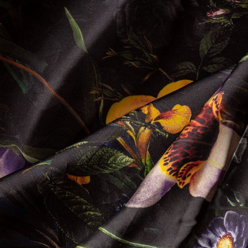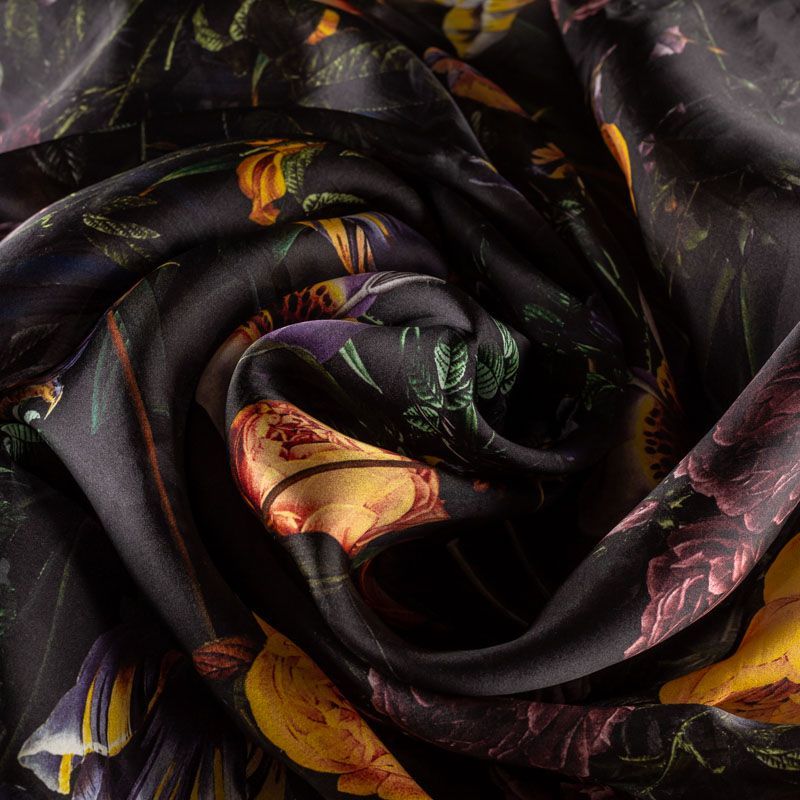 Шелковая органза с крупным ярким цветочным принтом на черном фоне. Хорошо держит форму, легкая, тонкая, просвечивает. Подойдет на блузку, платье, тунику или юбку.
