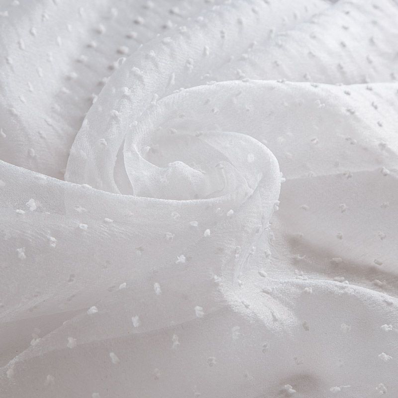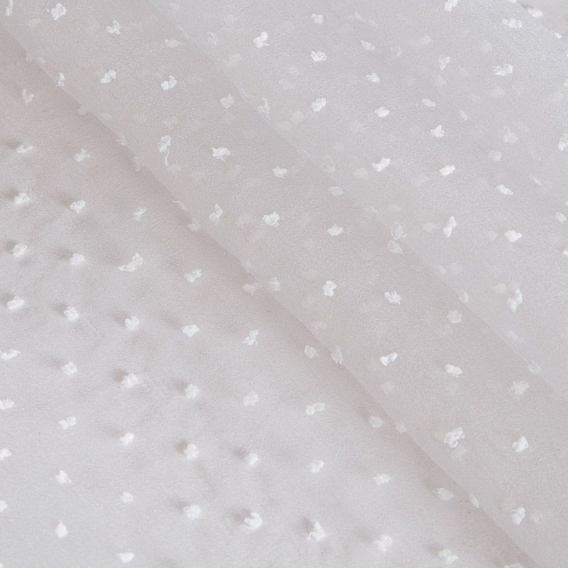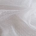 Легчайший, изящный, воздушнный и прозрачный материал с благородной переливчатой поверхностью. Прекрасно держит форму в заложеных складках. На лицевой стороне объемные декоративные элементы из флока диаметром 0.5 см. Подойдет для создания в изделии декоративных деталей, новогодних костюмов, нарядных платьев, блузок.