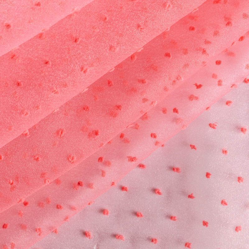 Легчайший, изящный, воздушнный и прозрачный материал с благородной переливчатой поверхностью. Прекрасно держит форму в заложеных складках. На лицевой стороне объемные декоративные элементы из флока диаметром 0.5 см. Подойдет для создания в изделии декоративных деталей, новогодних костюмов, нарядных платьев, блузок.