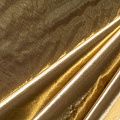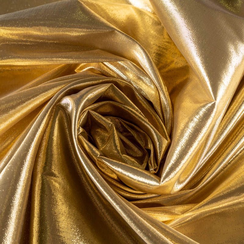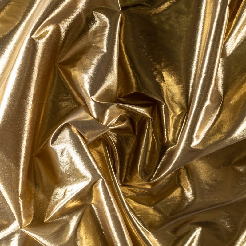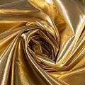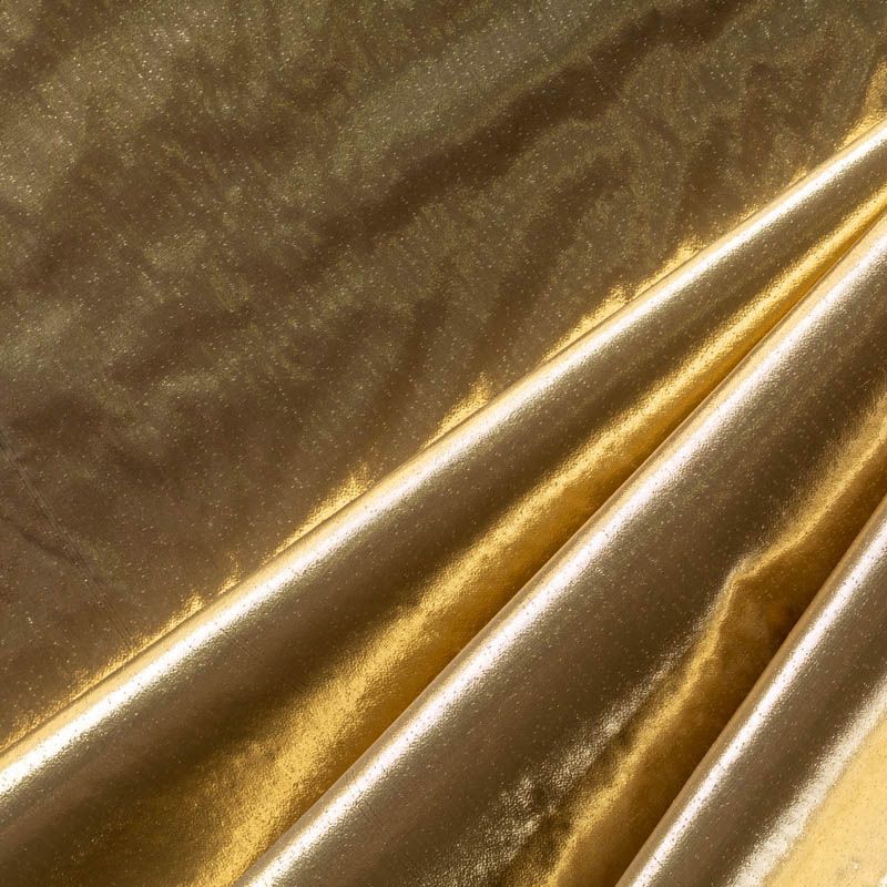 Тонкая, очень легкая ткань, похожая по внешнему виду на жидкий металл. Полотно шуршащее, переливается золотом, ткань хорошо держит форму, не мнётся, немного просвечивает. Отлично подойдёт для пошива театральных и парадных костюмов и декорирования изделий.