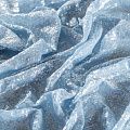 Тонкая эластичная сетка голубого оттенка по всей поверхности усеяна мелкими прозрачными глянцевыми пайетками. Ткань очень хорошо драпируется, красиво переливается, имеет глянцевый блеск, пластичная и эластичная и в длину, и в ширину. Пайетки — идеальный материал для праздников и вечеринок. Из них получится эффектное платье, жакет, боди, топ, туника, юбка или комбинезон.