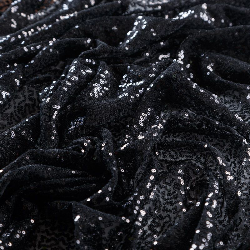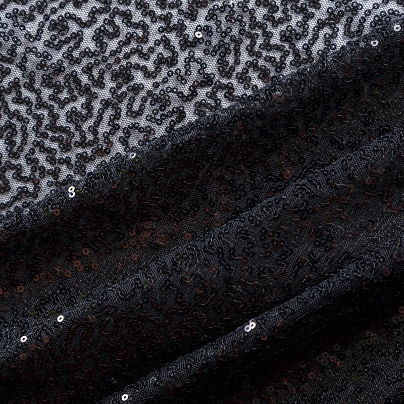 Тонкая эластичная сетка черного цвета расшита мелкими глянцевыми пайетками в тон основе. Ткань очень хорошо драпируется, красиво переливается, пластичная и эластичная и в длину, и в ширину, благодаря чему изделия получаются комфортными и отлично сидят по фигуре. Пайетки — идеальный материал для праздников и вечеринок. Из них получится эффектное платье, жакет, боди, топ, туника, юбка или комбинезон.