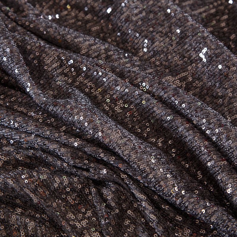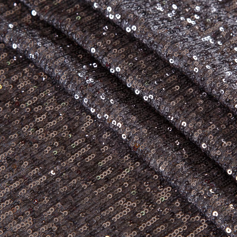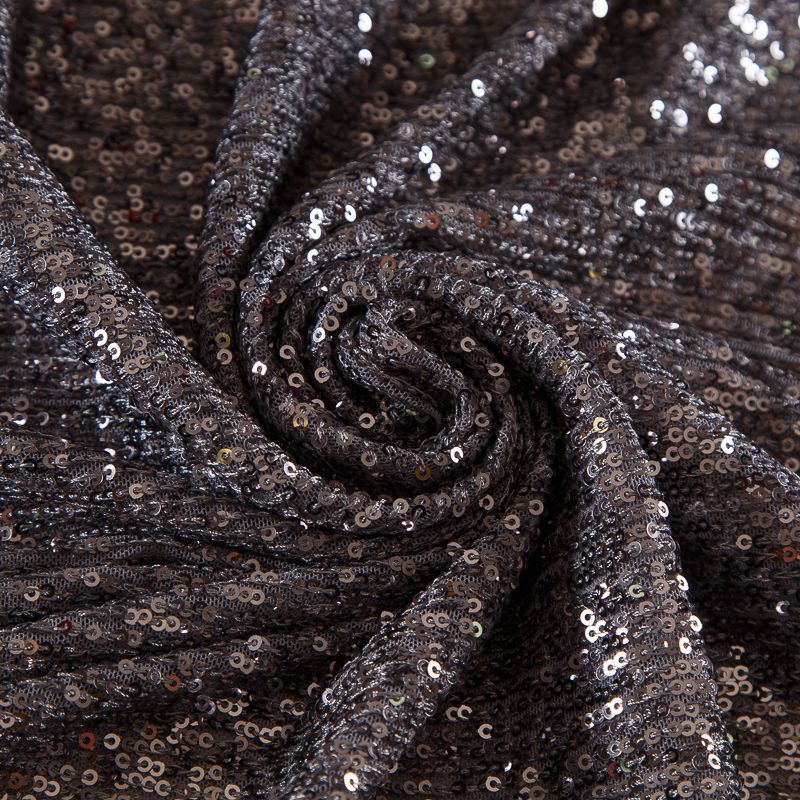 Нашитые полосками мелкие пайетки расположены от кромки до кромки. Ткань набирается на изделие объемом.