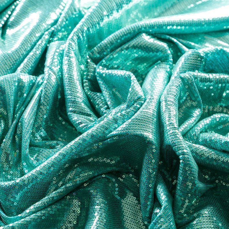 Блестящие пайетки в бирюзовом оттенке. Мелкие, размером около 3 мм, расположены в хаотичном порядке. Основа - мягкая и эластичная сетка.  Ткань полупрозрачная, может потребоваться подклад. Подойдет для вечернего, коктейльного платья, юбки, нарядных детских изделий, танцевальных и сценических костюмов.
