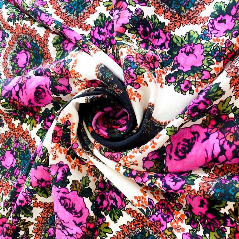 Платок выполнен из натурального итальянского шелка с креповой поверхностью. Очень красивый рисунок в фольклорном стиле по типу павлопосадских узоров в цвете фуксия на черном фоне. Шикарная вещь украсит образ и будет отличным дополнением к Вашему наряду.
