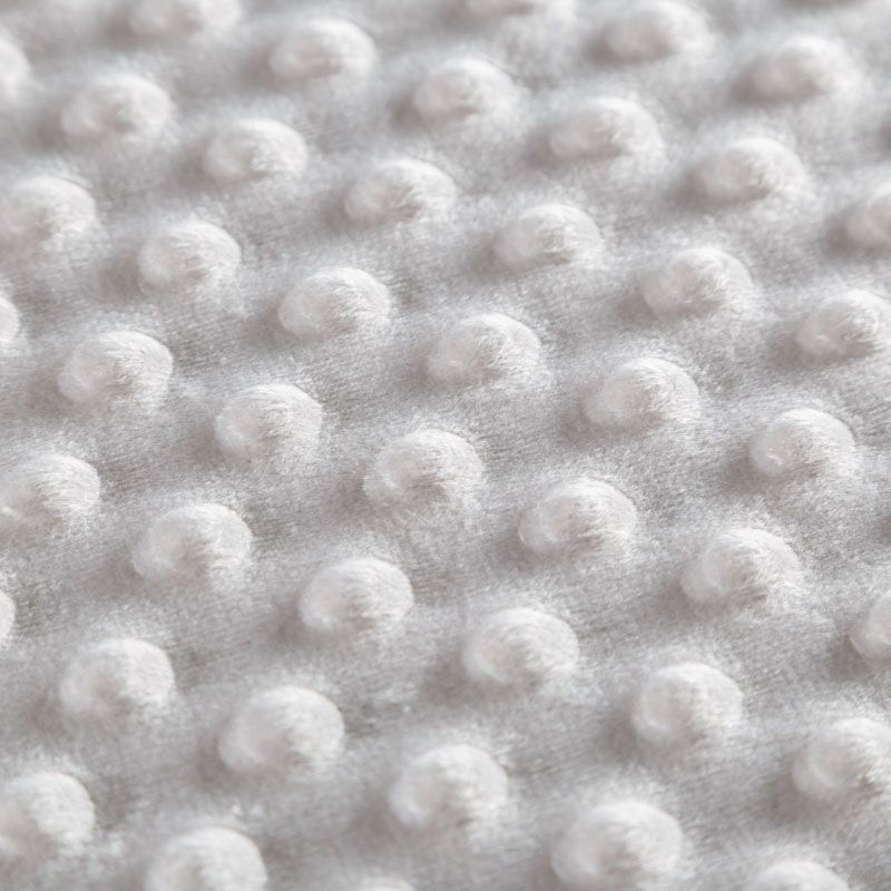 Мягкое, нежное, приятное на ощупь, с гладкой текстурой, красивым блестящим эффектом. Фактура – пузырьки. На лицевой стороне мягкий ворс 1 мм. Изнаночная сторона  — гладкое  трикотажное полотно без ворса. Используется  для пошива покрывал, пледов, одеял, бортиков в кроватку, конвертов для новорождённых, мягких игрушек, комбинезонов, пижам, домашней одежды, лежанок для домашних питомцев.