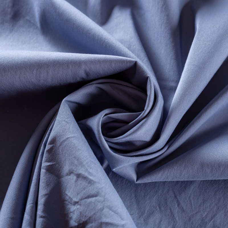 Однотонный плательно-рубашечный хлопковый поплин голубого оттенка. Ткань лёгкая, слегка прозрачная, поверхность матовая, гладкая, приятная к телу, хорошо драпируется, тянется за счет эластана в составе. Прекрасно подойдет блузы, платья-рубашки, летнего сарафана, туники.