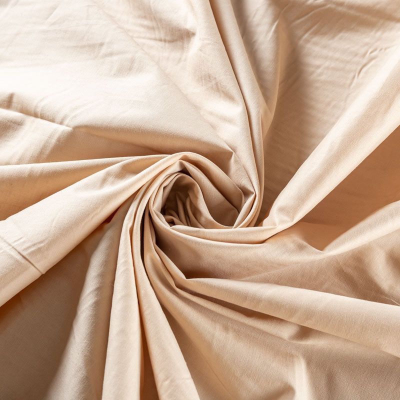 Однотонный плательно-рубашечный хлопковый поплин бежевого оттенка. Ткань лёгкая, слегка прозрачная, поверхность матовая, гладкая, приятная к телу, хорошо драпируется, тянется за счет эластана в составе. Прекрасно подойдет блузы, платья-рубашки, летнего сарафана, туники.