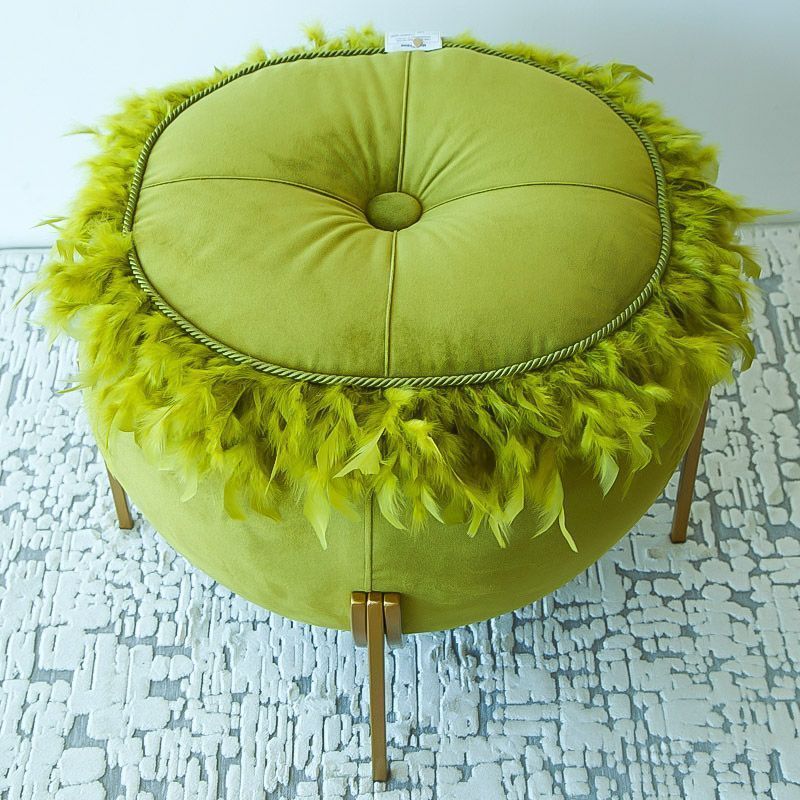 Ориганальный дизайнерский пуф выполнен из бархата грушевого оттенка, декорирован кантом и перьями. Ножки выполнены из окрашенного металлического профиля. Диаметр сидения - 50 см, диаметр в основании - 65 см, высота от пола - 51 см.