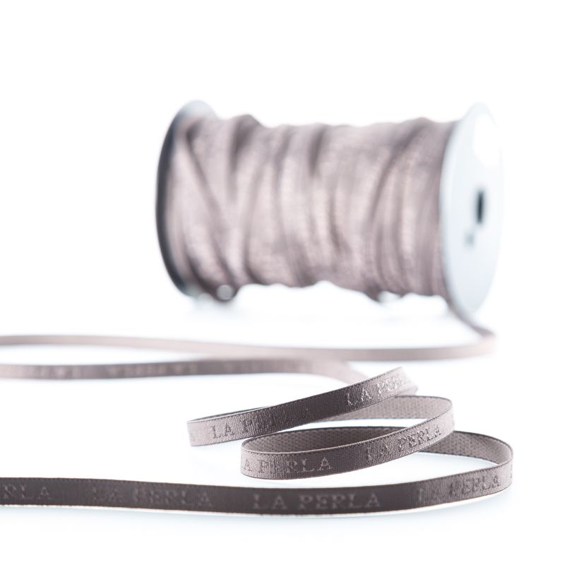 Бретелечная резинка используется для обработки стана бюстгальтера, а также для бретелей. Матовая с жаккардовой надписью бренда. Края ровные.